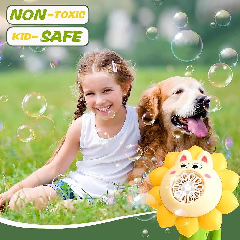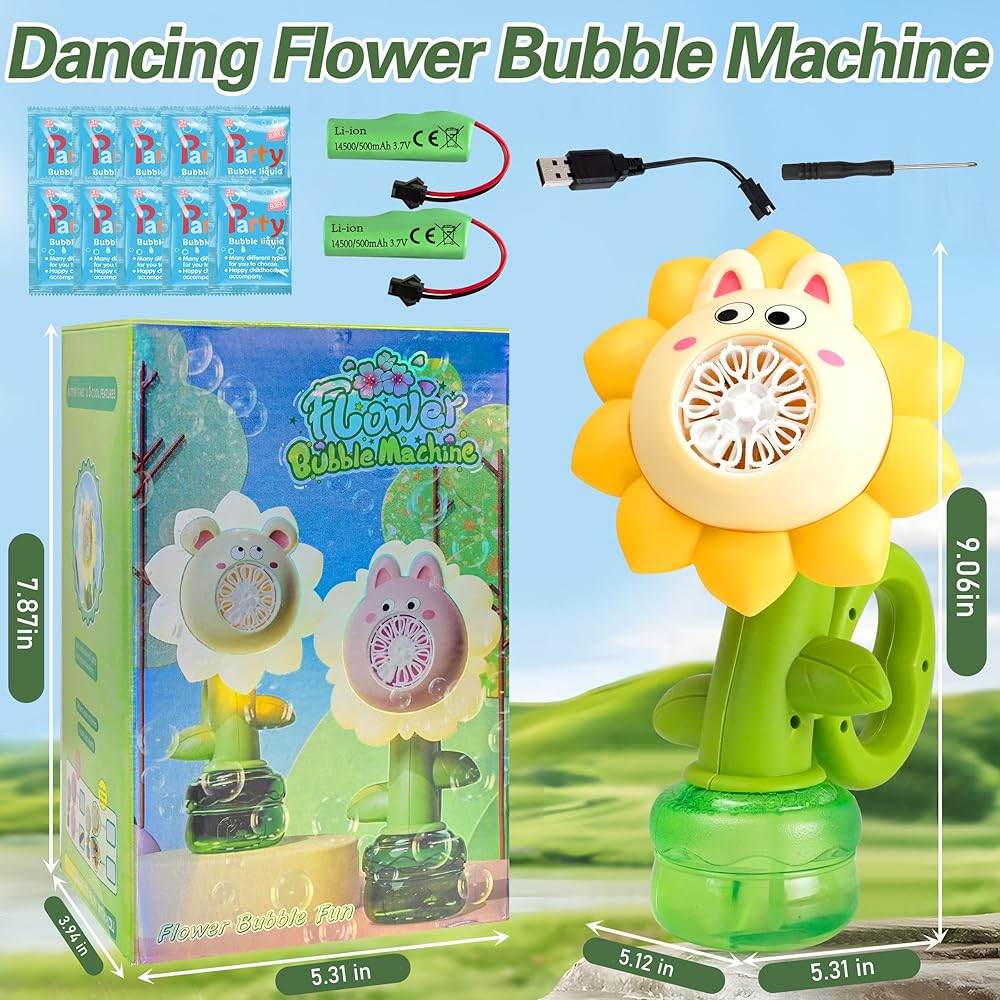 🔥 1. 20,000+ Bubbles/Min & 7-Color LED Light Show Watch magical rainbow bubbles burst from dancing sunflower petals! Upgraded motor creates 5x denser bubbles than regular machines, while colorful LEDs transform day/night play into a glowing wonderland – perfect for Instagram-worthy party moments!