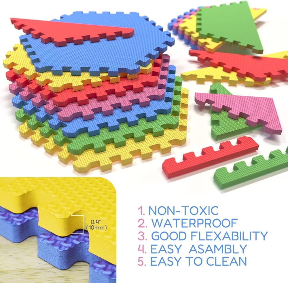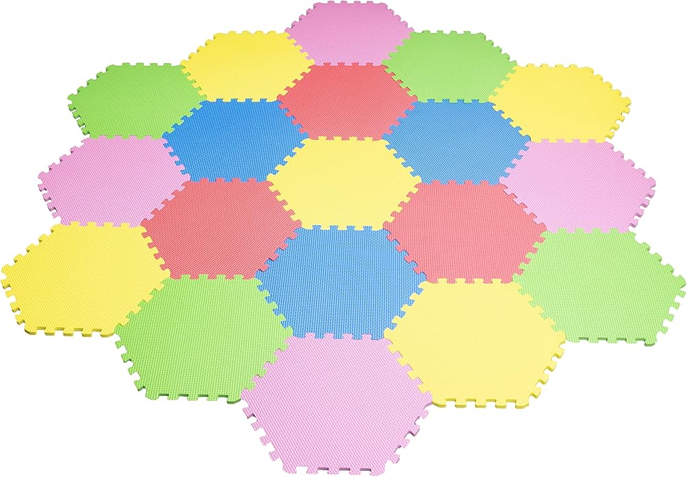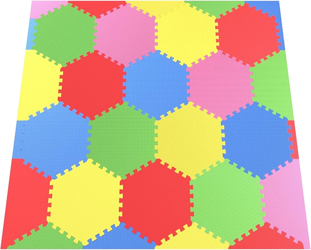 Let your child's imagination run wild with these new creative Hexagon Mats 13 Cubic Feet You will get 31 pieces in this package covering almost 13 Cubic Feet of Space in 5 different Colors Perfect to cover your playroom, baby room and these come in Vibrant Blue, Green, Red, Yellow, Pink colors making it fun for a kids room and or play room The mat material is non-toxic make it safe for the whole family - Washes away very easily and stores neatly and nice. - Safe for kids free of BPA and lead, suited for adults, kids and Babies of all ages. Has it's multi purpose and uses from covering a floor for protection to making a comfortable floor for your baby to play, dog to relax, kids to make things with them and adults to exercise.