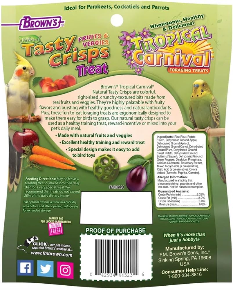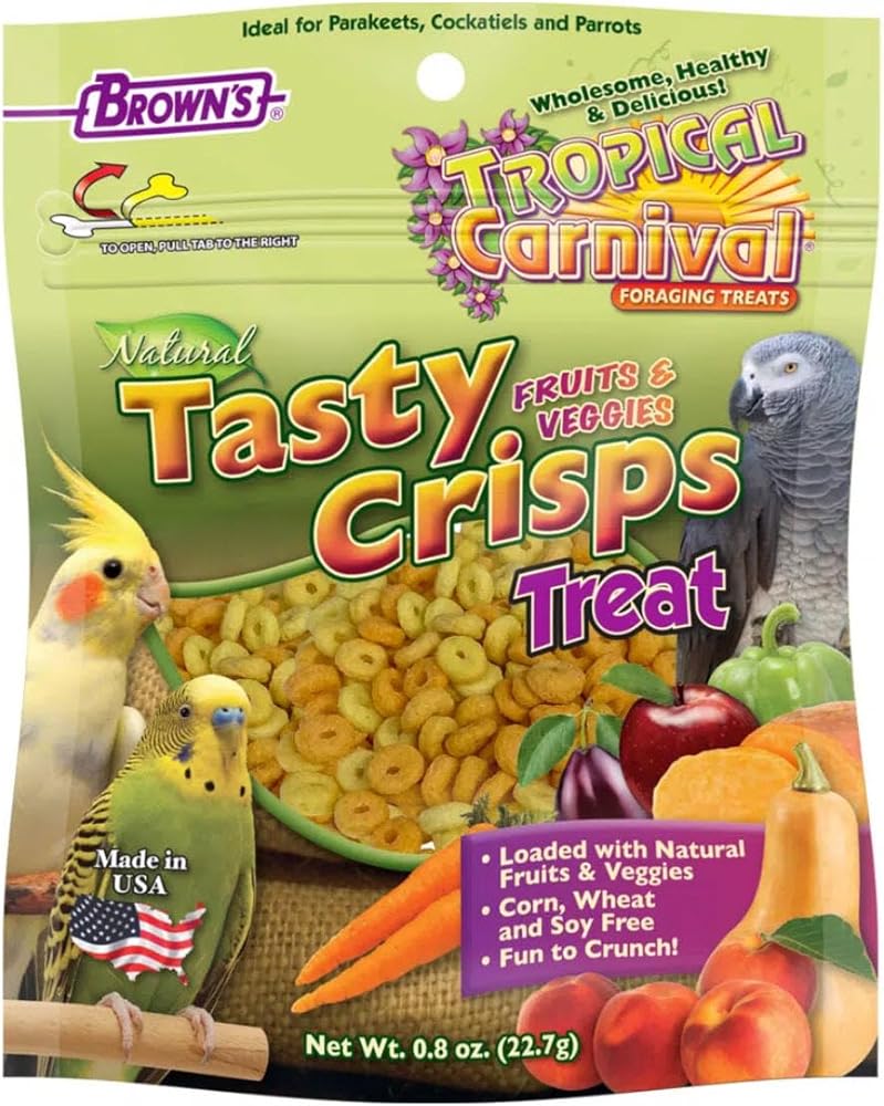 Brown's Tropical Carnival Natural Baked Crisps are colorful, right-sized, crunchy bits made from fruits and veggies. They're bursting with antioxidants, minerals, nutrients and flavor. These fun crisps offer a variety of benefits to your pet including highly palatable tastes, sweet aromas and a crunchy texture for gum and beak maintenance.