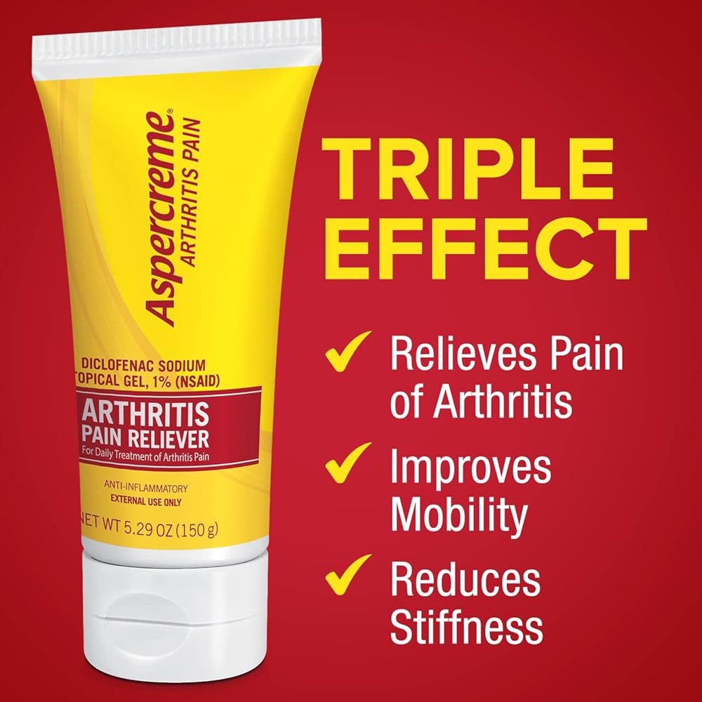 Relieve arthritis at the source of pain with Aspercreme Arthritis Pain Relieving Gel. This medicated topical gel provides long-lasting relief from arthritis and joint pain* in up to two joints at the same time, including hands, wrists, elbows, feet, ankles and knees. The prescription-strength formula contains diclofenac sodium 1%, a clinically-proven nonsteroidal anti-inflammatory medicine that relieves arthritis joint pain, reduces stiffness, and improves mobility. Unlike pills,** Aspercreme Arthritis is applied directly to the joint to give you relief from your arthritis joint pain. It's an effective alternative to OTC oral analgesics. Keep a tube of Aspercreme Arthritis Pain Relief Gel in your medicine cabinet, purse or gym bag so you always have powerful arthritis pain relief on hand. *When applied 4 times a day. It might take up to 7 days to relieve arthritis pain. **Refers to diclofenac sodium 50-mg enteric-coated tablets taken orally 3 times daily