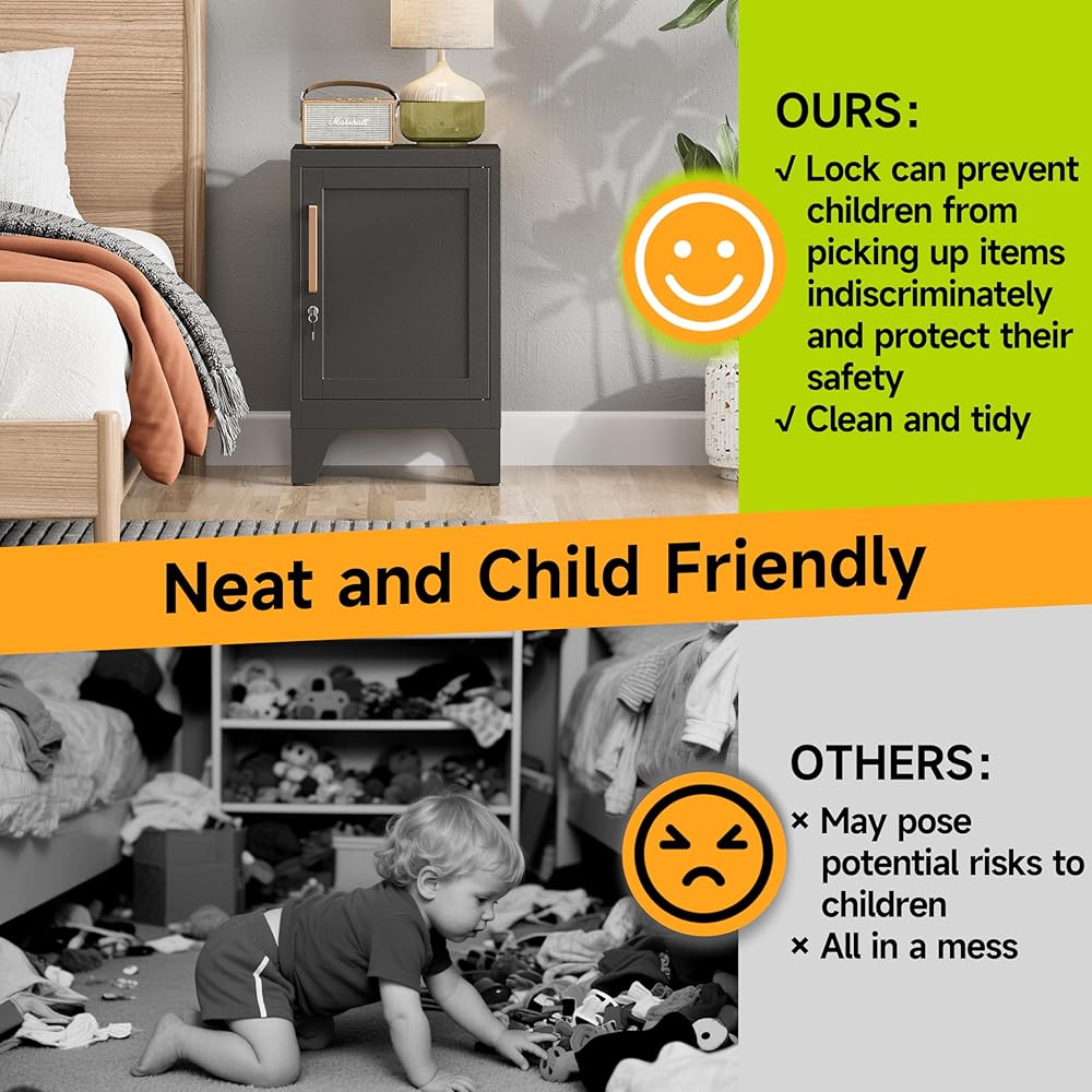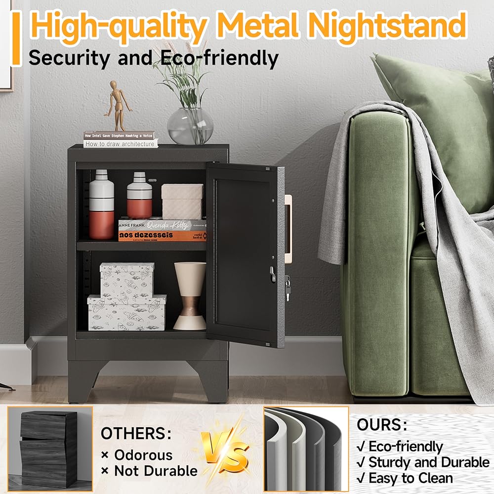 【Multi Functional】A modern high-quality metal locking cabinet that can be used to hold items such as lights, alarms, or other night time essentials. It can also be placed next to the sofa in the living room to make a practical coffee table, which can be used to place drinks, snacks, books, or remote controls. It can be used in any room or small space, such as offices, garages, apartments.
