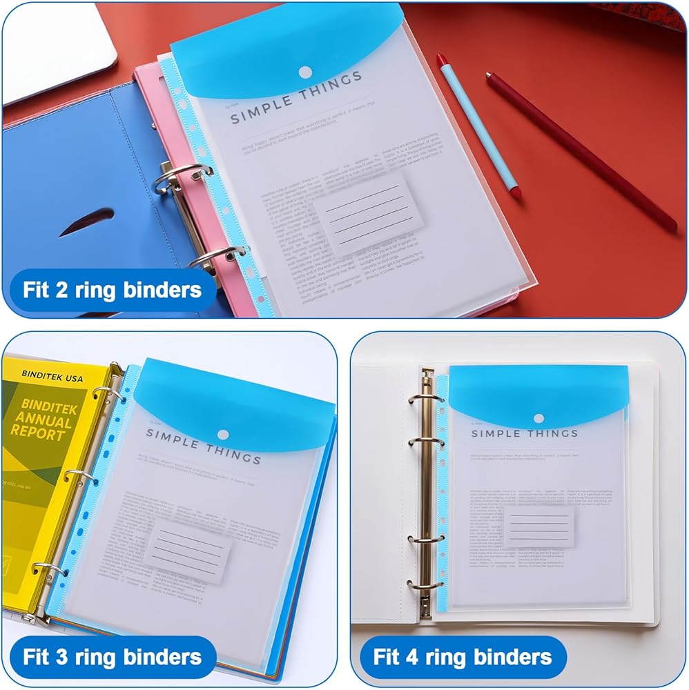 【Practical & Portable】- 11 Holes punched binder pocket dividers can fit for 2/3/4 ring binder. Designed with a hook and loop fasteners closure, binder folders can be stacked neatly for saving space. Ideal for storing documents, checks, receipts and bills, letters and photos etc. Keep your items organized and help you sort the clutter, perfect for important documents and small office supplies.