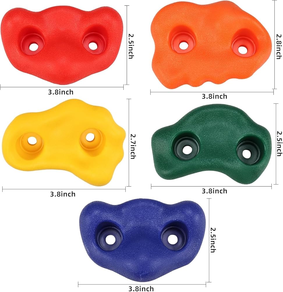 The Rock Climbing Holds are weather resistant and intended to be mounted onto outdoor jungle gym, playsets, swingsets, or climbing walls. The wall rocks also complement jungle gym accessories, playset accessories outdoor set, DIY rock climbing wall, or swing set accessories.