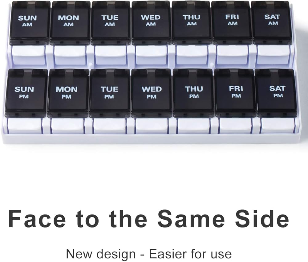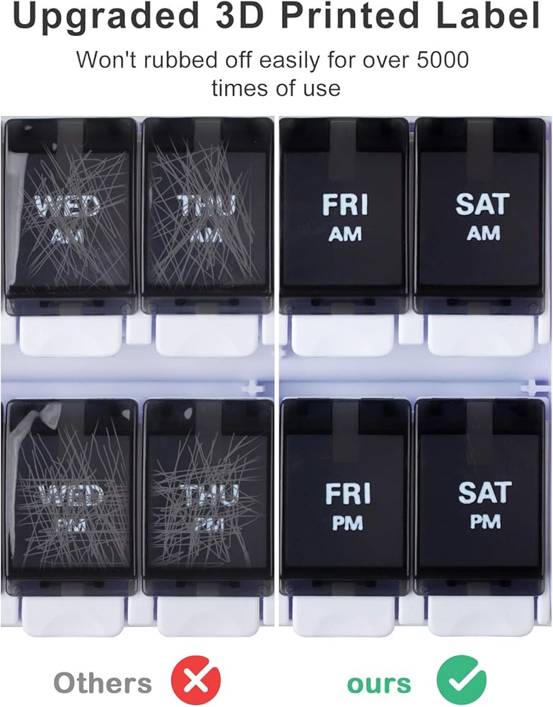 BOLD MARK & NO NEED TO REMEMBER: This AM PM pill organizer bold marks of the week clearly let you know what pills to take each day. The upgraded printing guarantees that the marks will last for up to 20,000 uses without wear and tear.