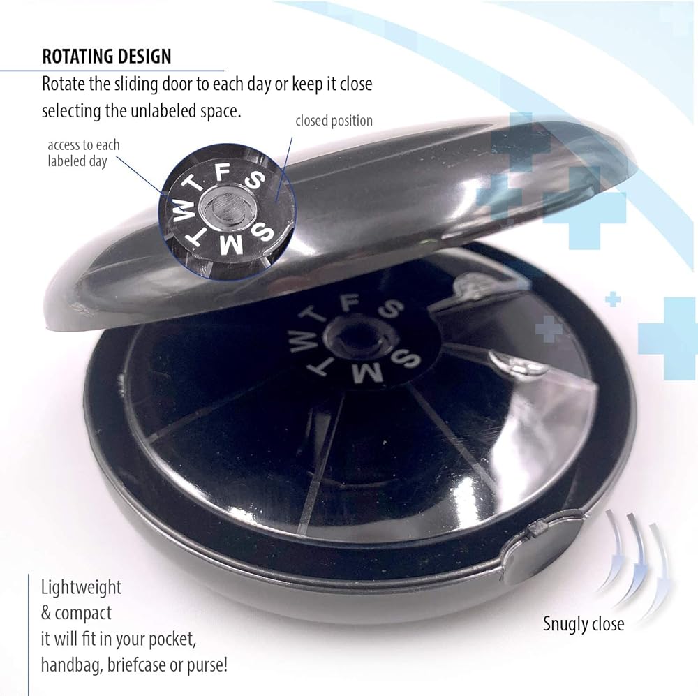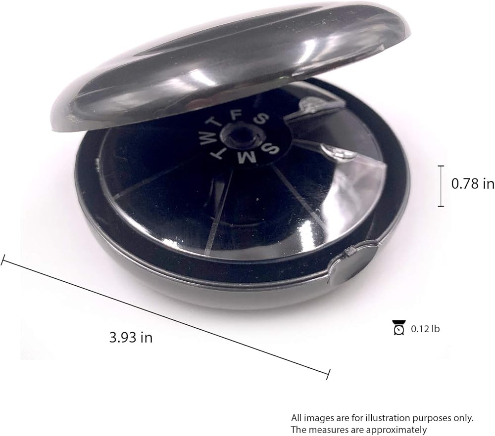 3.93" x 0.78" Great reminder for elderly, seniors and all. ortable and very convenient for carrying pills, little trinkets or memory card. Best choice as a pill organizer for travel, daily use and weekly carrying. This pill dispenser fits well in your pocket or purse.