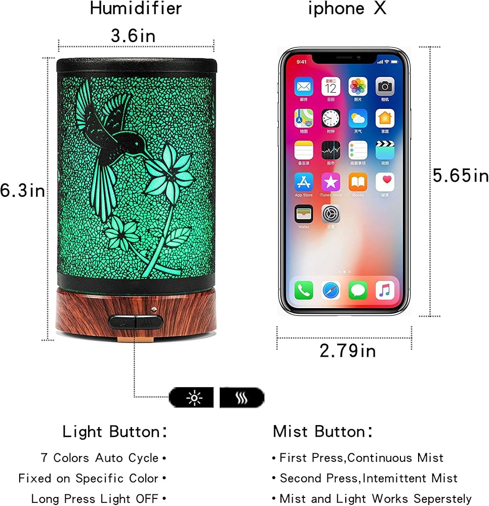 【7 Color Led Lights & 2 Mist Modes】The ultrasonic oil diffuser has 7 color led lights, each color has bright and dim, or turn off all lights for total darkness.You can adjust the mist with 2 modes. Intermittent mist (30 seconds on/30 seconds off), continuous mist. Working time: 3-4 hours in continuous mode, 6-8 hours in intermittent mode.You can choose your prefered color and mist mode to meet your different needs.