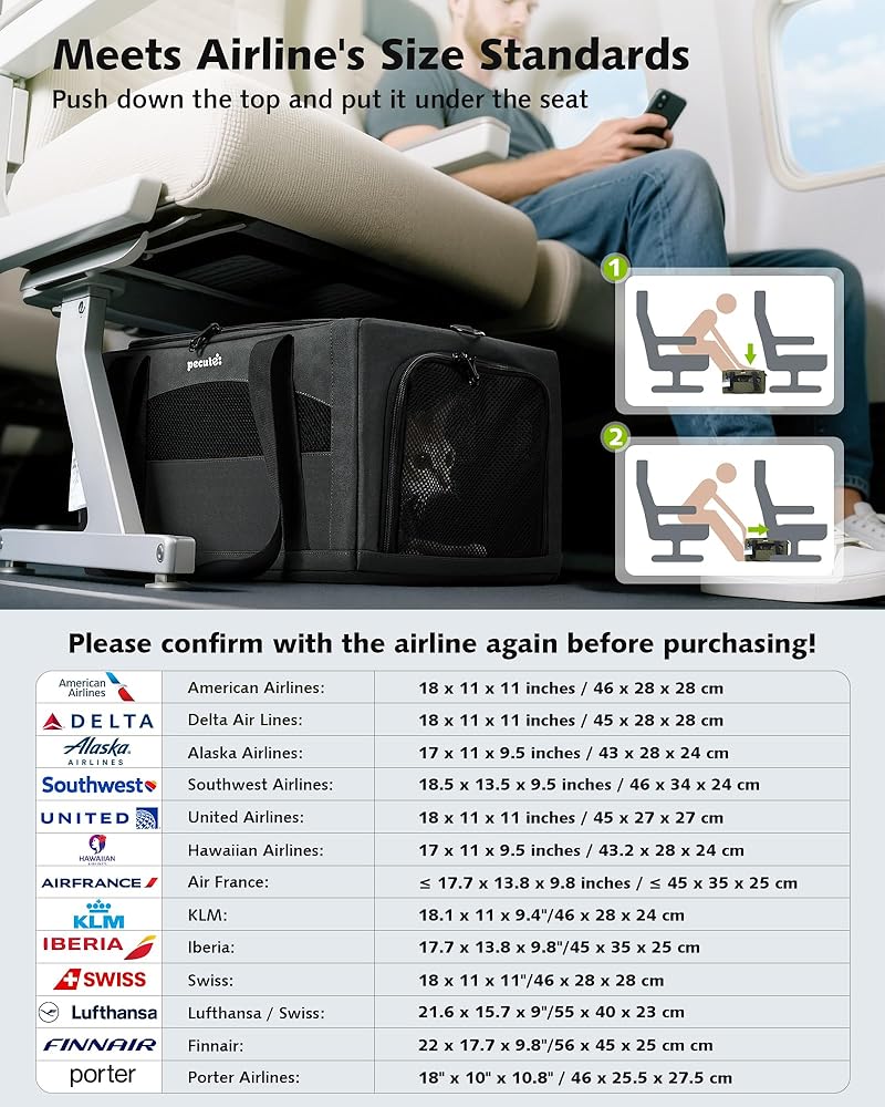 【Airline Approved Pet Carrier】Pecute pet carrier size:16.5"L x 11"W x (9+4.7)"H.Product weight: 3.9lbs. Pecute pet carrier is airline approved and can be placed underneath the seat directly in front of you in the cabin. The following airlines are eligible: American Airlines(18"L x 11"w x11"H), Delta Airlines(18"L x 11"w x11"H), United Airlines(18"L x 11"w x11"H), Alaska Airlines(17"L x 11"w x9.5"H), Southwest Airlines(18.5"L x 13.5"w x9.5"H), Hawaiian Airlines(17"L x 11"w x9.5"H), Frontier Airlines(18"L x 14"w x11"H). Recommended for pets under 11 lbs.