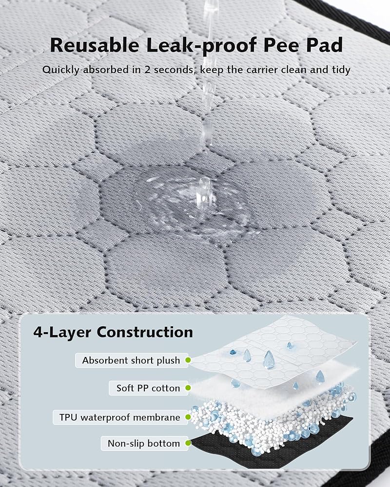 【Reuseable Leakprrof Pee Pad & Storage Bag】The bottom of the pet carrier bag is equipped with a reusable leak-proof pee pad to avoid accidents when the pet is out. The side storage pocket can also store some necessities that the pet needs immediately.