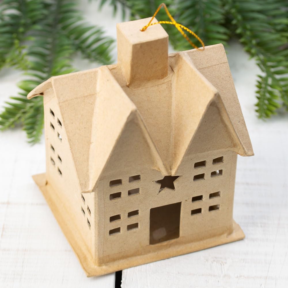READY TO DECORATE: This Pack of 3 Paper Mache House Ornaments make a great DIY project. Easily customizable and perfect for holiday decor; functional storage with a removable roof-lid, ideal for illuminating with a battery-operated candle to create a warm, glowing ambiance; versatile set of 3 ornaments for DIY projects like crafting a Christmas village, enhancing train set displays, decorating Christmas trees, or creating charming tabletop and shelf decorations.