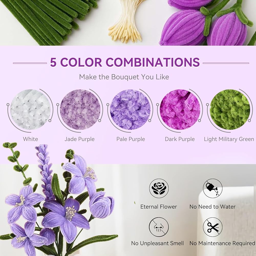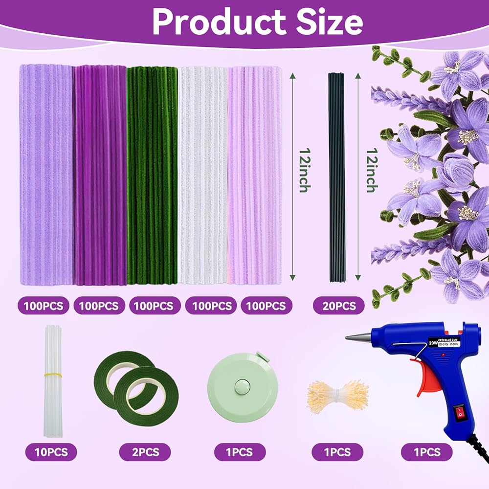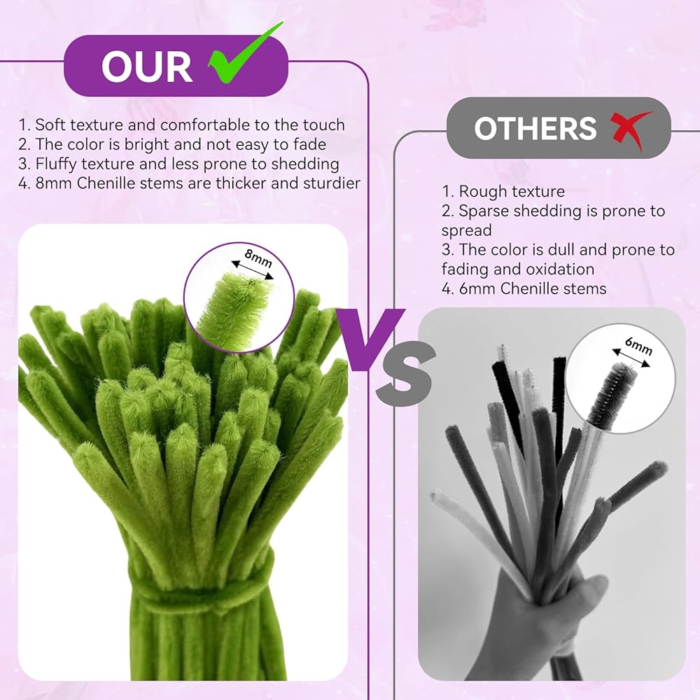 Pipe Cleaner Flower Kit: Our 8mm chenille stems are thicker and fluffier than standard 6mm versions on the market. They create fuller, more three dimensional, and lifelike flowers and crafts. Made with a strong steel wire core and soft, non shedding fabric, they are flexible, durable, and resistant to breaking even with repeated bending. This offers superior detail and shape retention