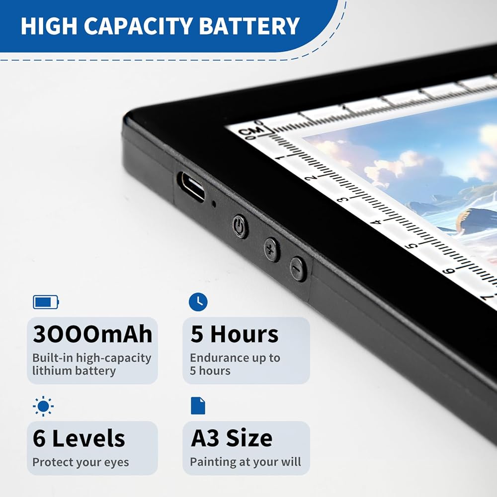【Powerful & Spacious Light Pad】With a 383 * 278mm large luminous area, it offers ample space for tracing. A 3000 mA battery gives 4 hour use, rechargeable in 2.5 hours. Great for various tracing and creative tasks.