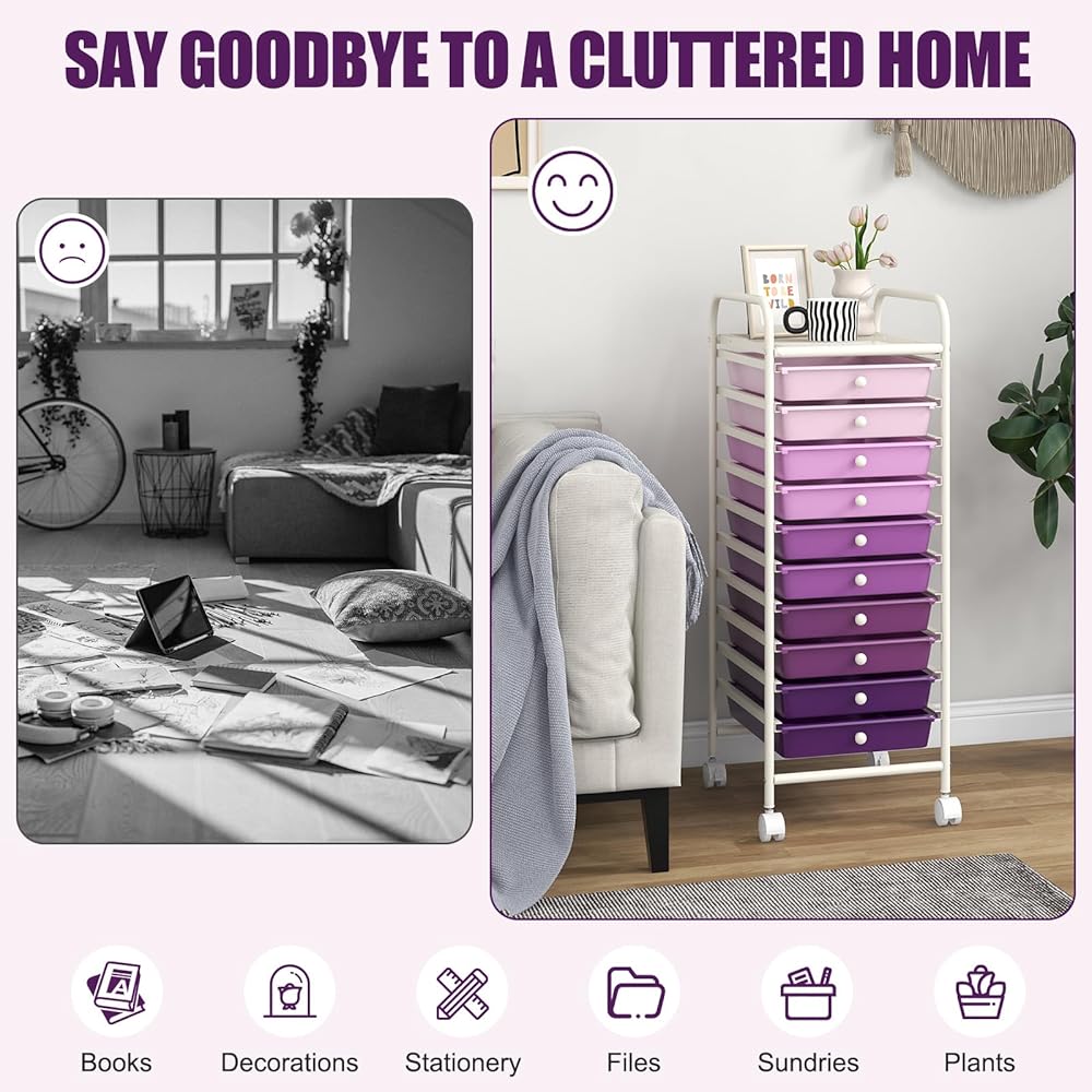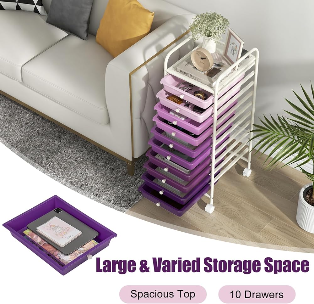 Our 10-drawer rolling organizer cart provides enough storage space to keep your workplace or home more organized and tidy. High quality steel frame and plastic drawers makes this cart sturdy and durable enough for long-term use. Four universal wheels allow the cart to freely change the direction of movement. And two wheels with brakes add extra stability. This craft cart is an ideal storage for living space, home, office or school.