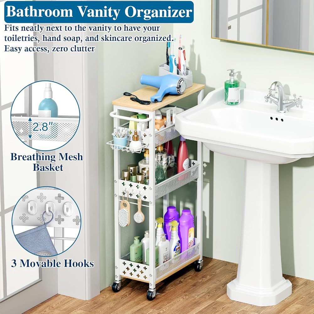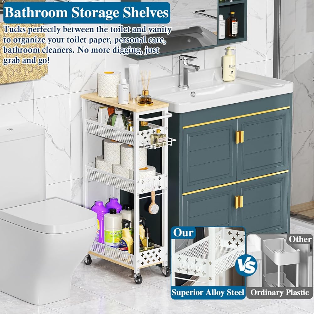 Sturdy and Rust-Proof: Crafted from premium alloy steel with a powder-coated finish, this bathroom organizer and storage cart resists rust and is durable enough for high-moisture areas like bathroom. The breathable mesh design prevents water buildup.