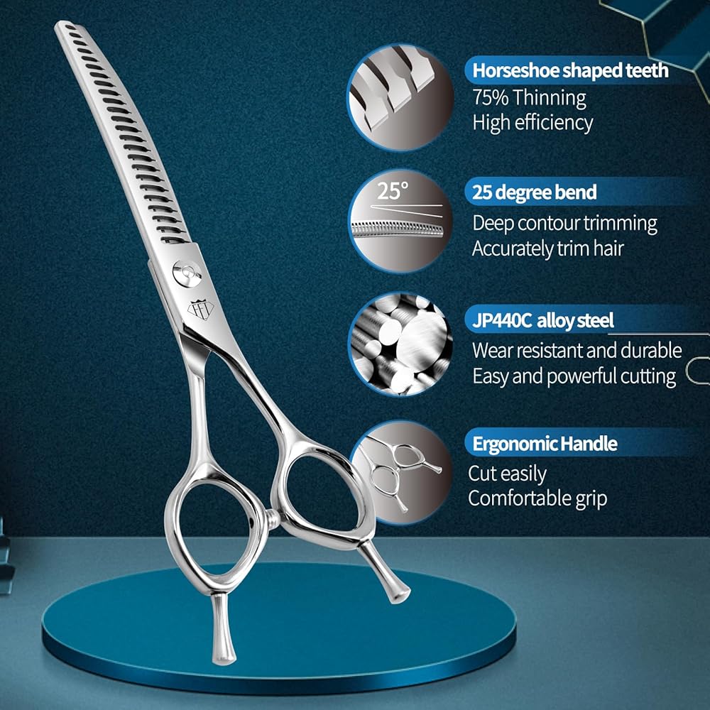 Features: This pet curved thinning scissors are available in 7.0 inches with ergonomic handles, suitable for most people. Finely polished, frosted surface, fine metal texture. precise adjustable screws effectively prevents screws from loosening due to prolonged use