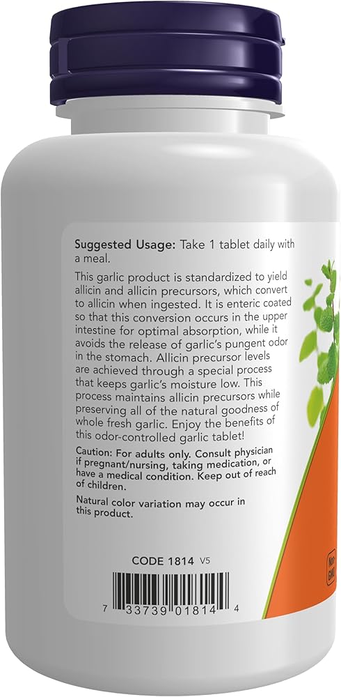 This Garlic product is standardized to yield allicin precursors, which convert to allicin when ingested. It is enteric coated so that this conversion occurs in the upper intestine for optimal absorption and to protect against garlic's pungent odor. The allicin precursor levels are achieved through a special process that keeps Garlic's moisture low. This process maintains allicin potential while preserving all of the natural goodness of whole fresh garlic. Enjoy the benefits of this odor-controlled garlic tablet! Natural color variation may occur in this product.