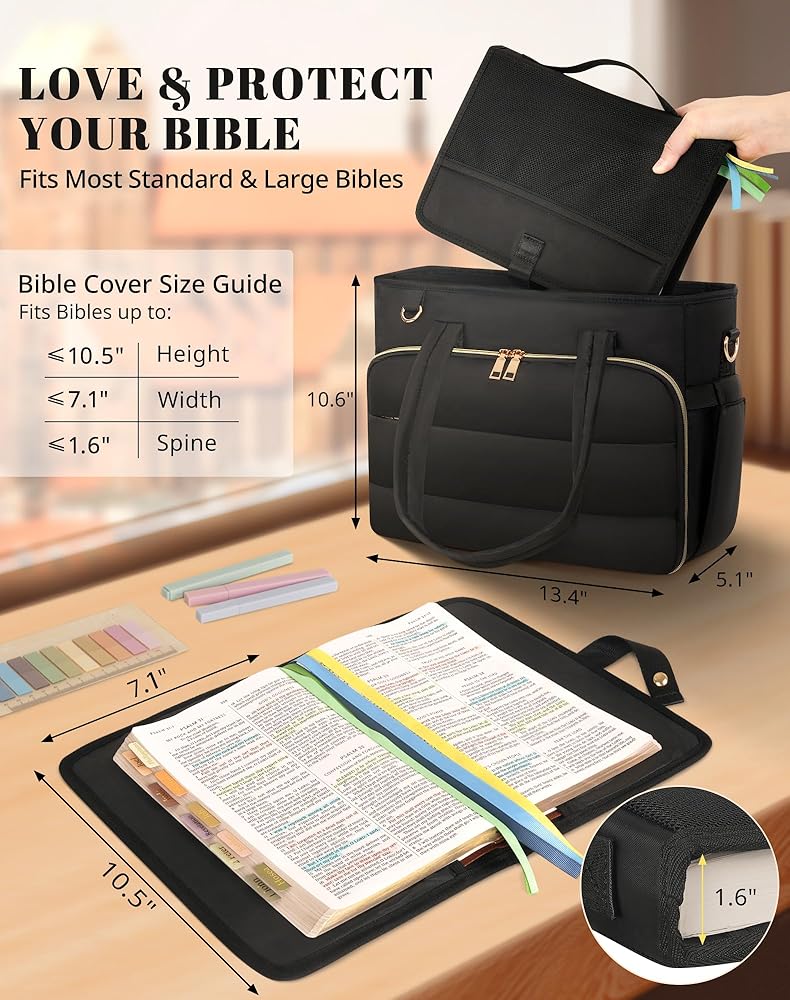 【Large Bible Cover & Tote Bag】This Bible tote bag comes with a detachable large Bible cover that fits most medium & large Bibles (up to 10.5" × 7.1" × 1.6"). A perfect Bible case for women to protect and carry the Word with ease
