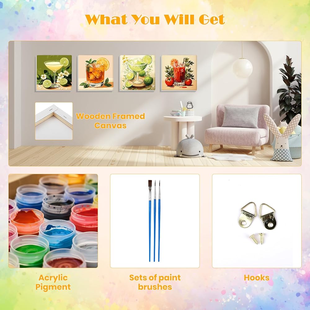 What You Get: Kids paint by number comes with everything you need. 4 digital painting kits including pre-printed textured art canvas (unframed), 8 high-quality paintbrushes.