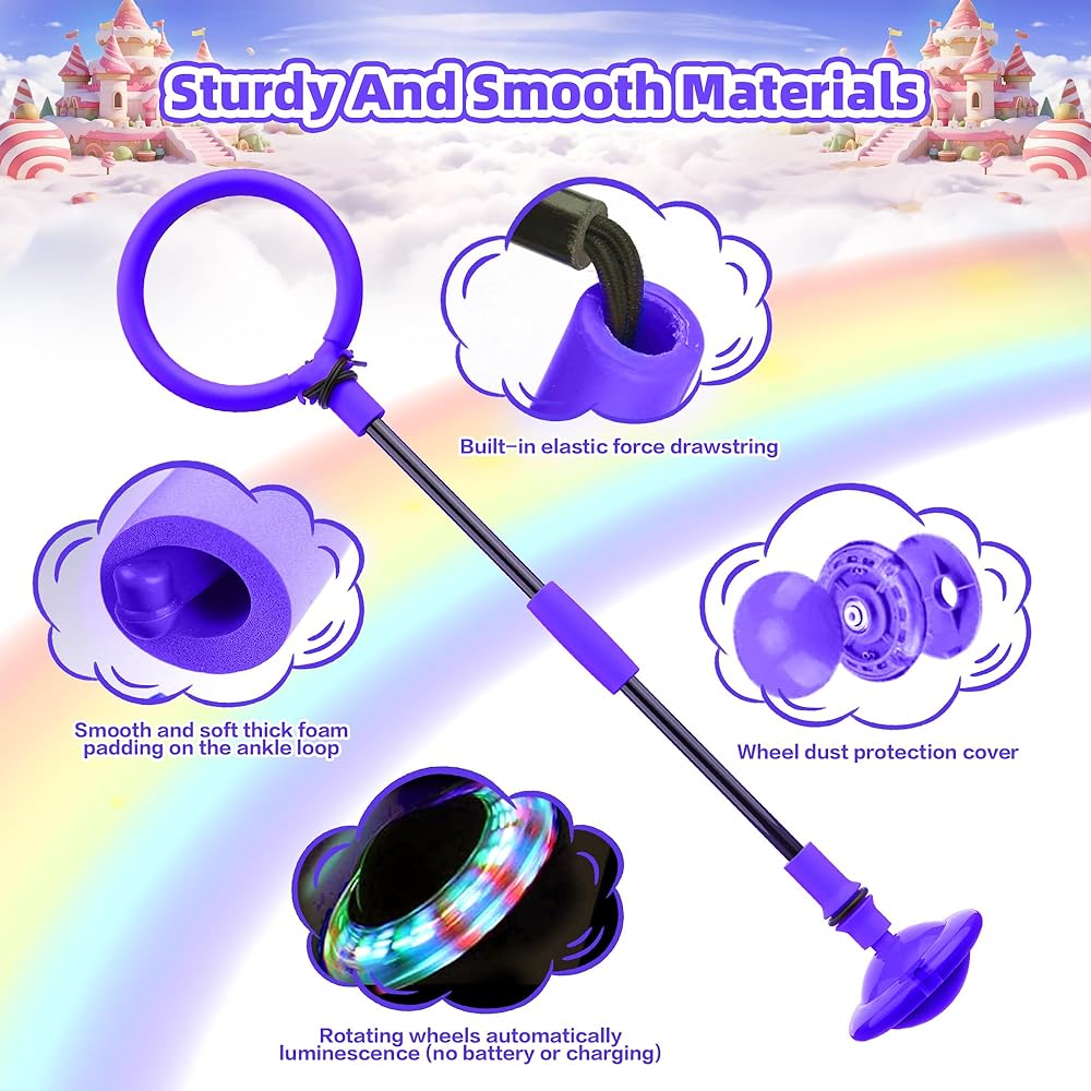 Colorful Led Wheel: The ankle skip ball toy has a built-in color flash wheel, no need to install batteries. Using magnetic induction rainbow lights to transform with jumping rhythms, creating dreamy light and shadow effects that turn monotonous movements into cool visual experiences.