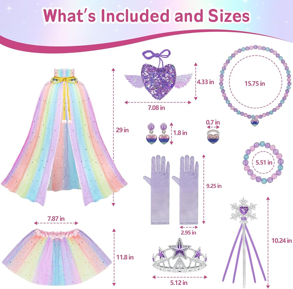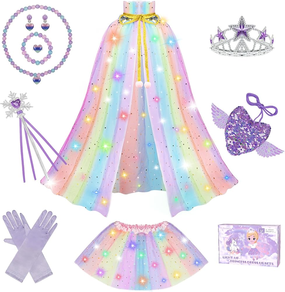 Complete Princess Costume Set: Girls dress up clothes include a light up unicorn cape, light up tutu skirt, pink wand, golden headband, pastel purse, and unicorn-themed toy necklace, bracelet, ring, and earrings-perfect for magical pretend play