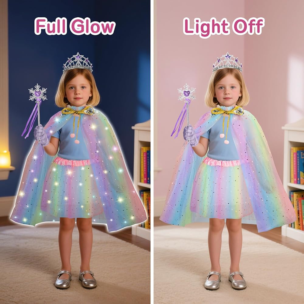 Magical Light Up Princess Dress: Princess dress up for girls features a dazzling pre-installed LED cape and tutu skirt with 3 lighting modes (steady, slow flash, fast flash). When the lights are turned on, the gold unicorn motif shimmers to life