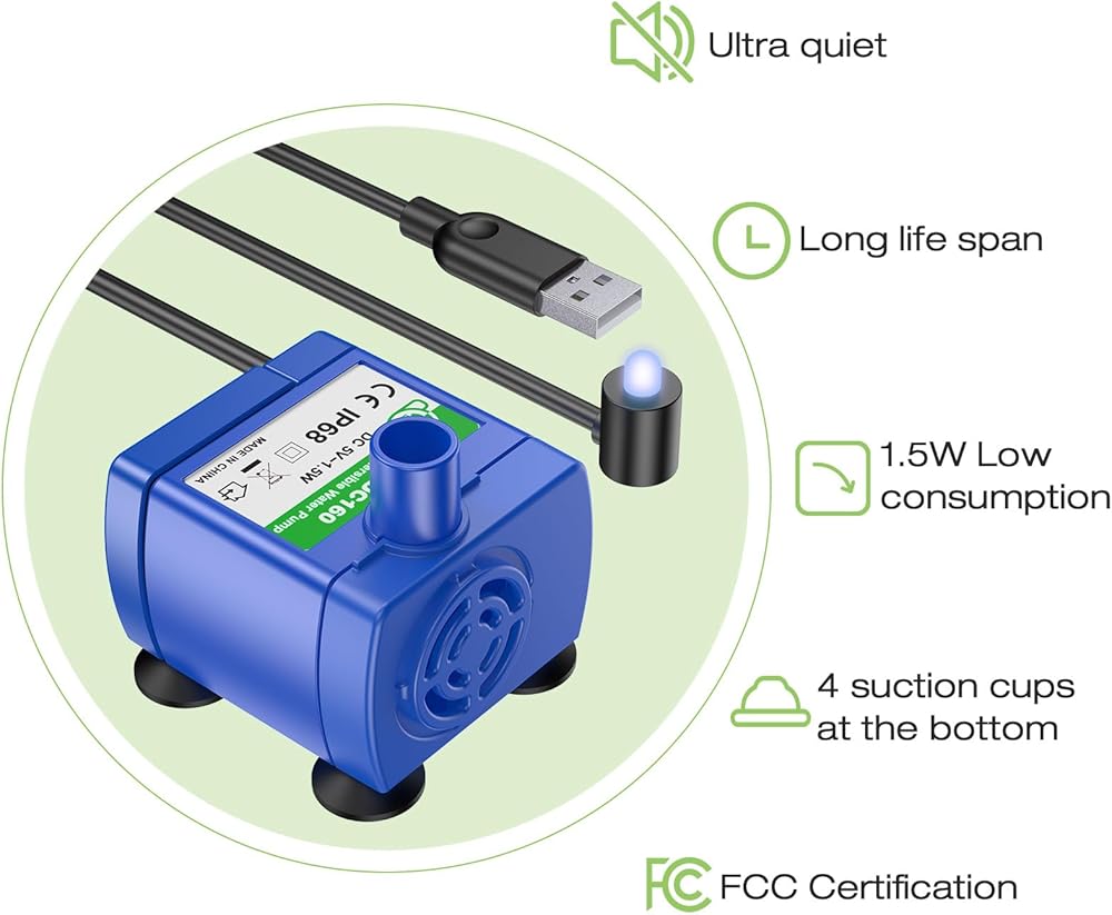 Circulating filtration system: A replaceable charcoal filter removes dirt and food particles, and a pre-filter sponge designed to catch hair and debris. This system ensures that your beloved pets have access to fresh, clean water.