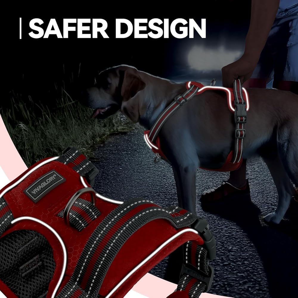 Anti-Pull: The VIVAGLORY no pull dog harness has dual leash attachments to reduce pulling and improve control. The front clip redirects your dog and corrects pulling—ideal for training and improving leash walking skills. It tucks into a mesh pocket when not used. The back D-ring suits daily walking, jogging, or hiking. The vest evenly distributes pressure to ensure no choking and protect the neck. Reinforced stitching and firm D-rings add heavy duty durability and safety for more enjoyable walks
