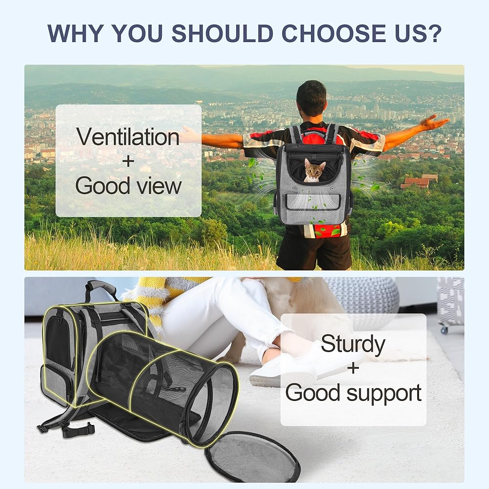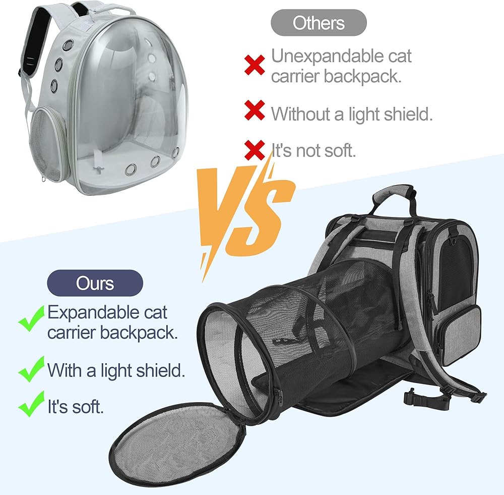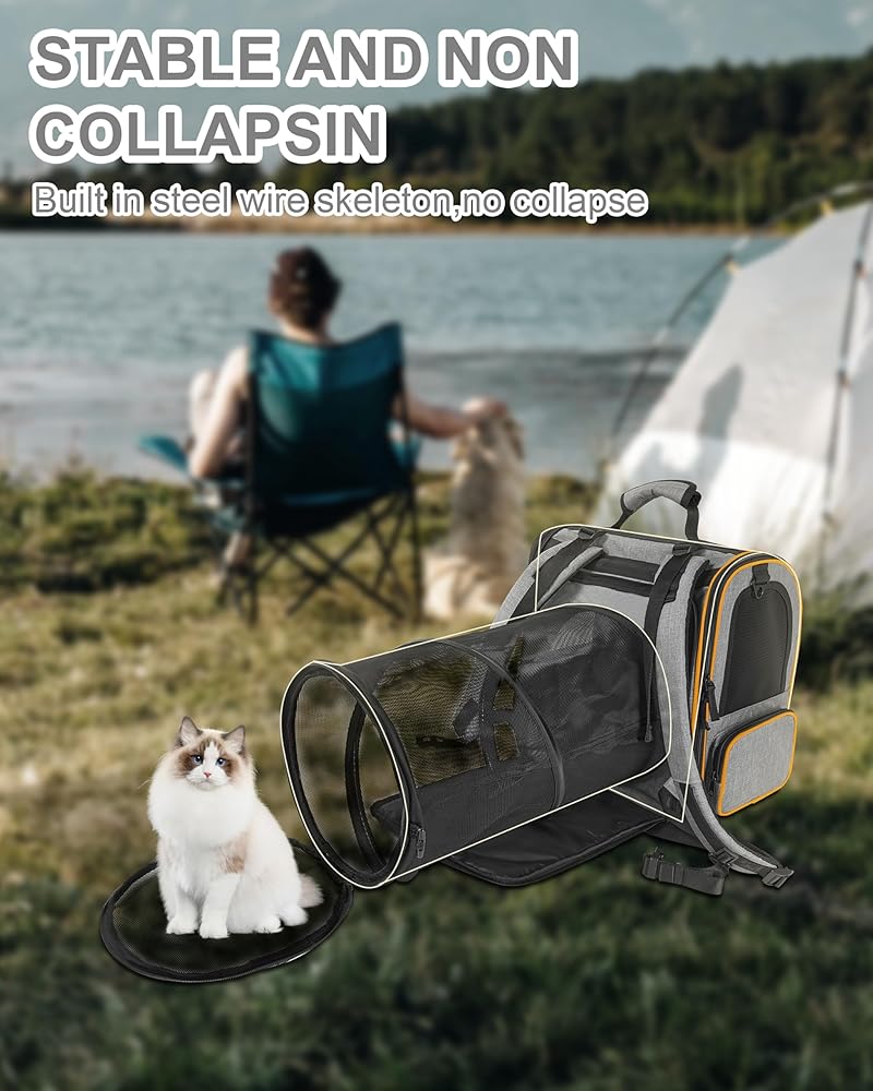 Cat Backpack Carrier: The cat carrier backpack is designed with your pet's comfort in mind. At the rear, a circular tunnel extension accommodates feline instincts and can be easily deployed or stowed. The front of the expandable cat backpack carrier includes a light-blocking shade to help calm anxious pets during travel. Reinforced with an internal steel frame, the cat backpack maintains its shape for long-lasting use while providing plenty of room for your cat to relax and move about freely.