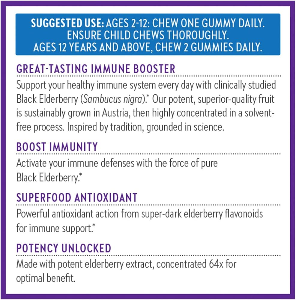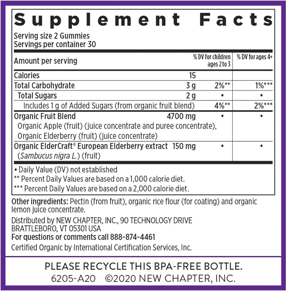 Supercharge your daily routine with great-tasting organic Elderberry gummies! New Chapter's highly concentrated Elderberry extract gives serious support for natural immune defenses in whole-food gummies made with real fruit, no cane sugar.* Your daily gummies can be a perfect immune booster throughout the year or at the first sign of an immune challenge.* Our super-dark fruit delivers powerful antioxidant action from Elderberry flavonoids for immune support.* Standardized ElderCraft® extract delivers the same rich profile of beneficial phytonutrients as pure Black Elderberry (Sambucus nigra), but 64 times more concentrated. Packs a punch for your immune needs! NO cane sugar. *These statements have not been evaluated by the Food and Drug Administration. This product is not intended to diagnose, treat, cure, or prevent any disease.
