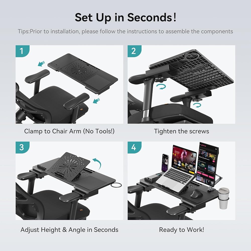 【3-Second Setup & Precise Compatibility】Clamp to chair arms in 3 steps (no tools!) - Tighten screws, adjust height, place devices. Fits 90% of T-shaped office chairs (armrest length >2.2", width <4.72", thickness <1.42").