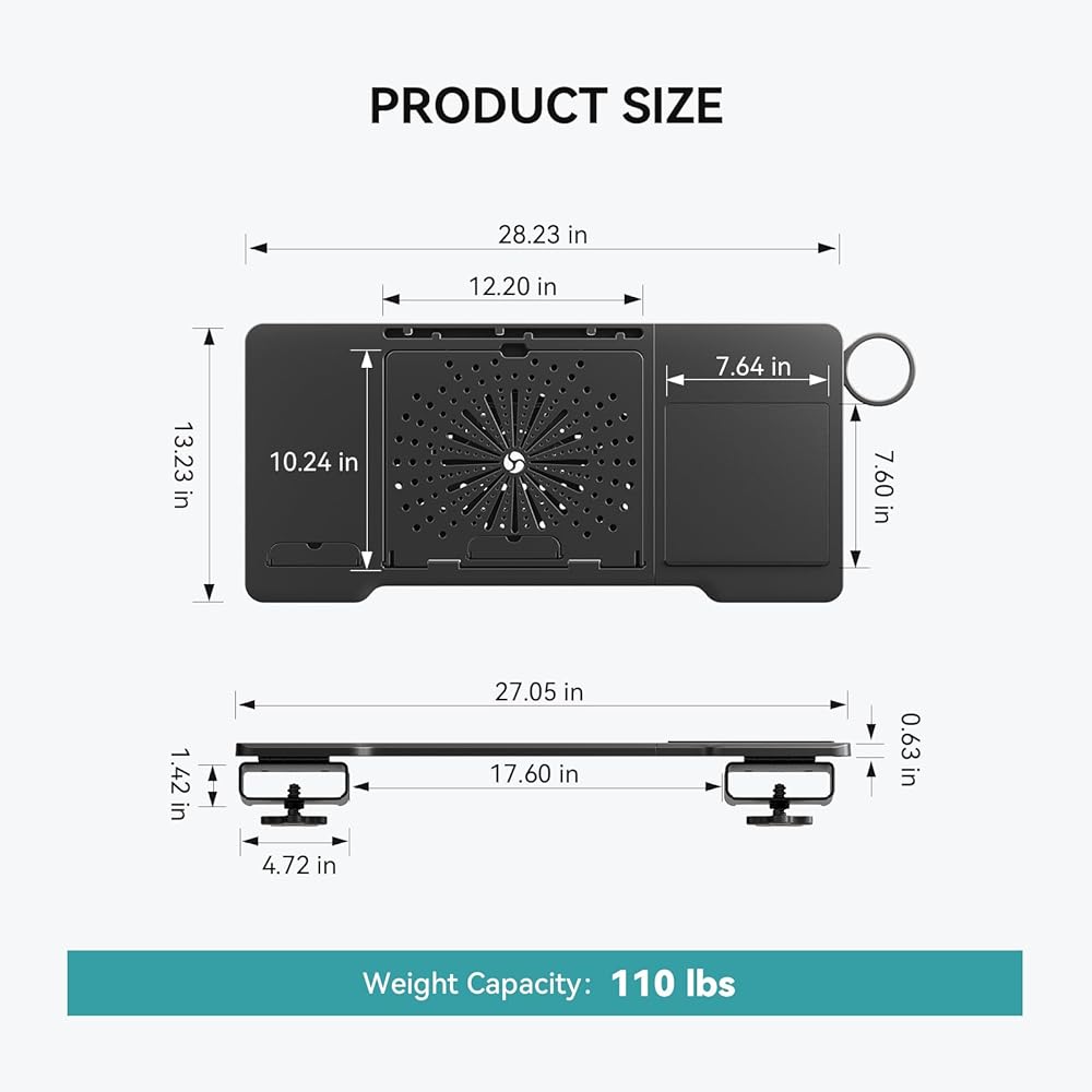 【Stability & Protection】Reinforced ABS frame supports 50kg/110lbs laptops. Features anti-slip laptop bar, ventilated cooling grooves , anti-tip edge, and wire slots to secure devices + prevent overheating during intensive tasks.