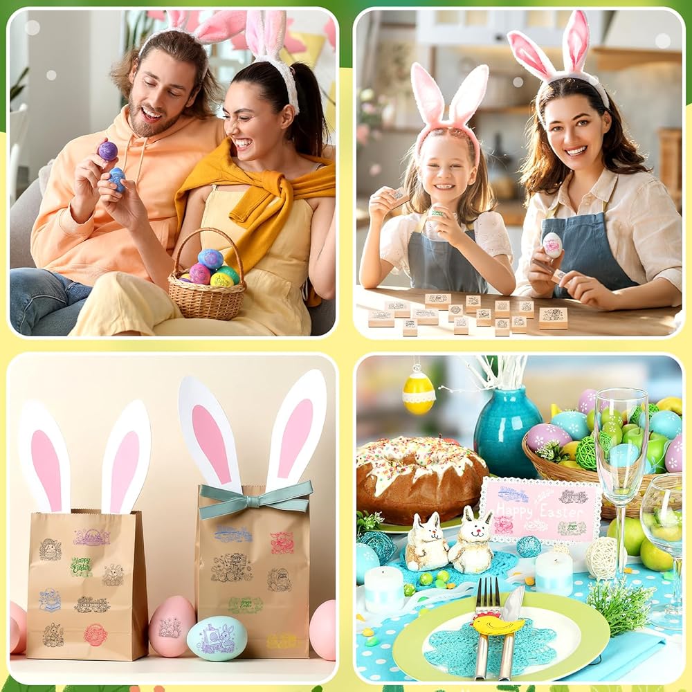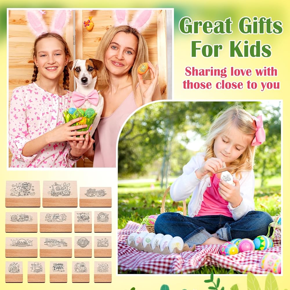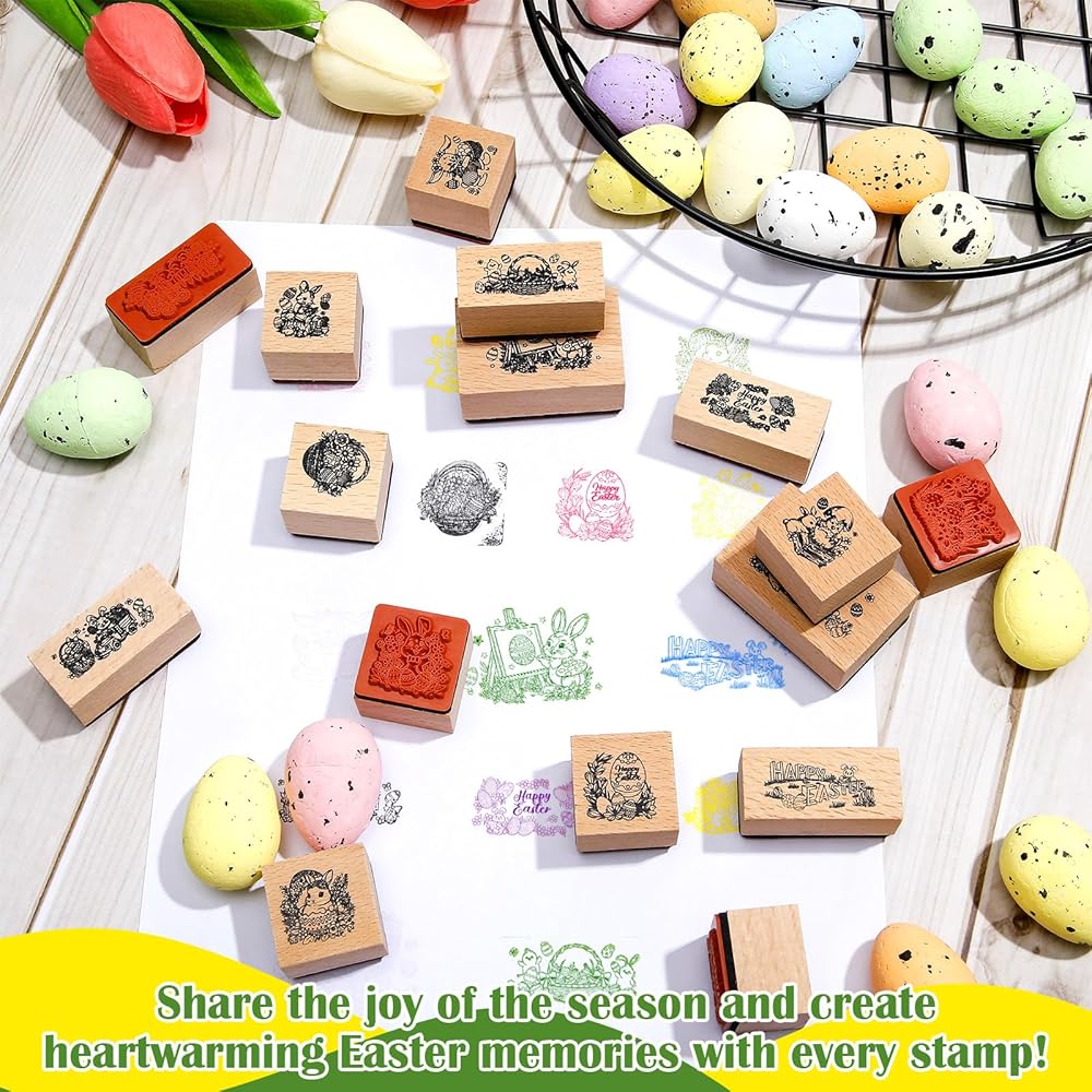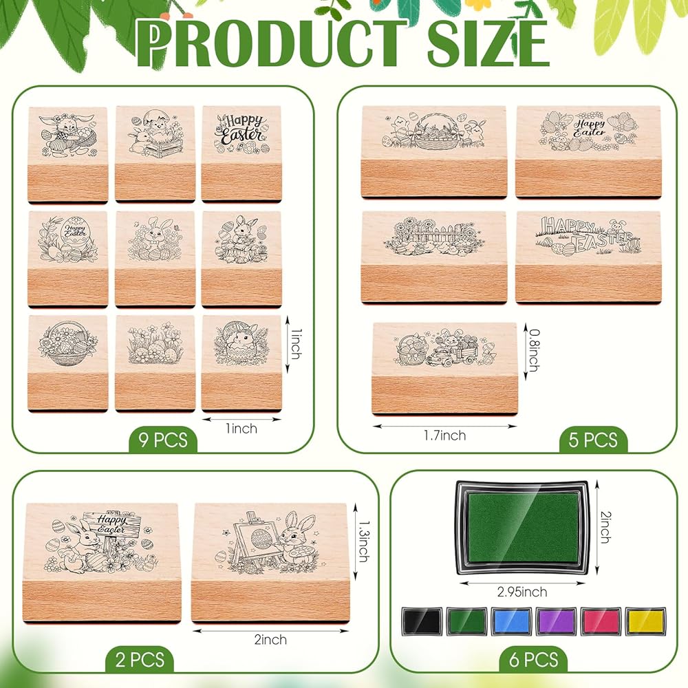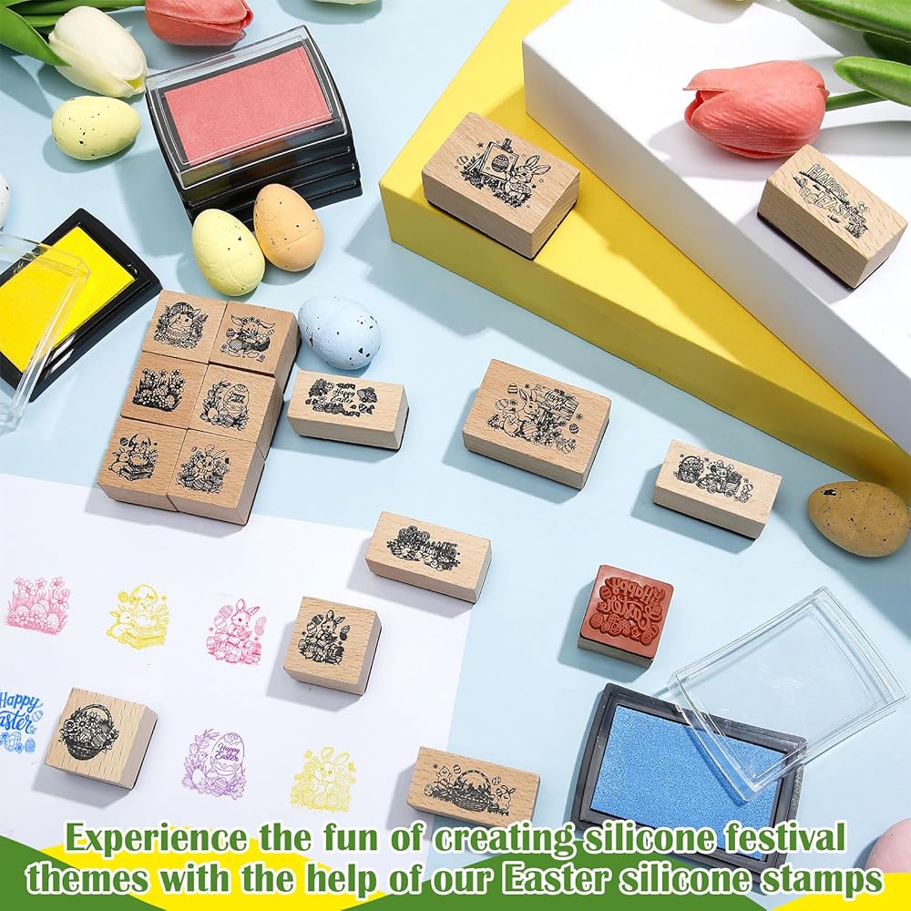 Marspark 22 Pcs Easter Wooden Rubber Stamps and Craft Ink Pads Set Mixed Easter DIY Cards Wooden Rubber Stamps for Party Scrapbooking Cards Making Supplies Gift Craft Decor