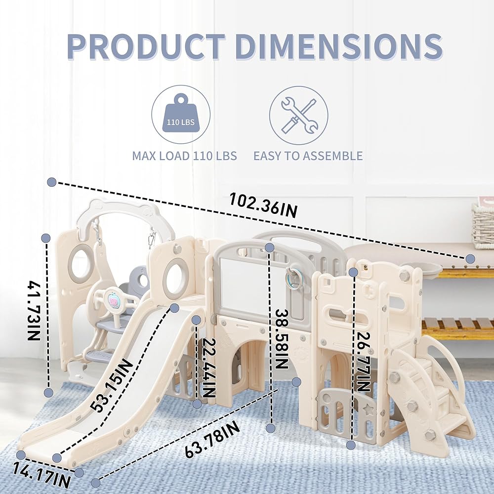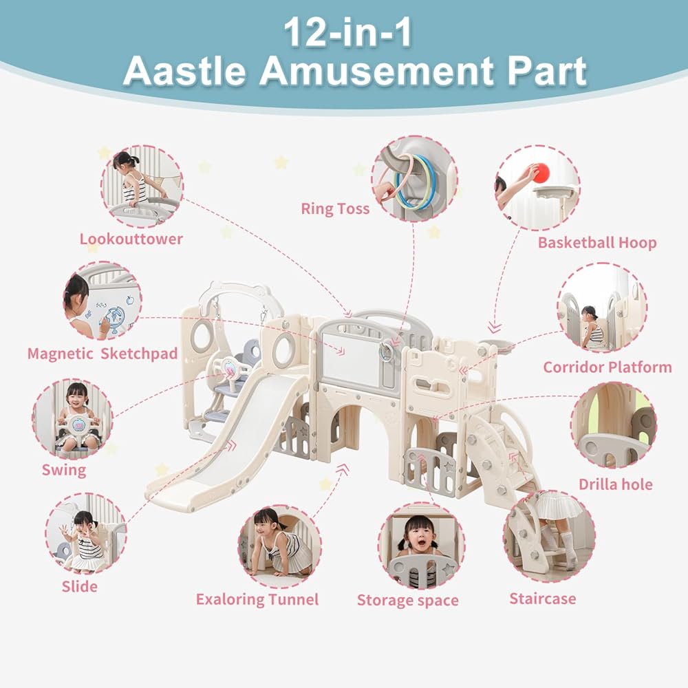 12 in 1 slide and swing set featuring climbing wall with slide, basketball hoop indoor outdoor playset playground, perfect for kids indoor outdoor fun and skill development