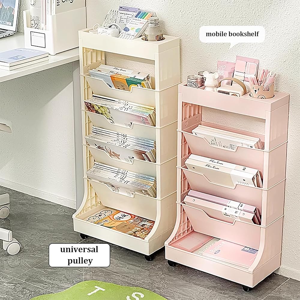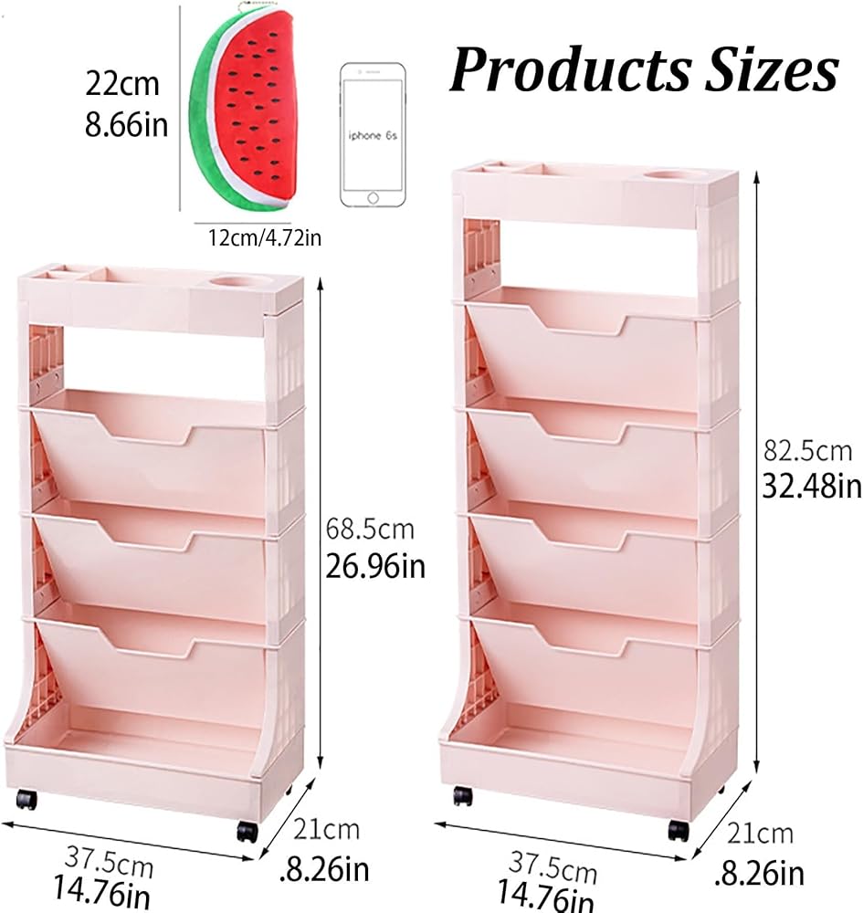 Organize your space in style with the Cute Rolling Cart with Shelves, a versatile and mobile 5-tier bookshelf that is perfect for your classroom, office, bedroom, or living room. Whether you need to store books, magazines, stationery, or small tools, this mobile bookshelf provides ample storage while maintaining a compact design that fits into tight spaces.