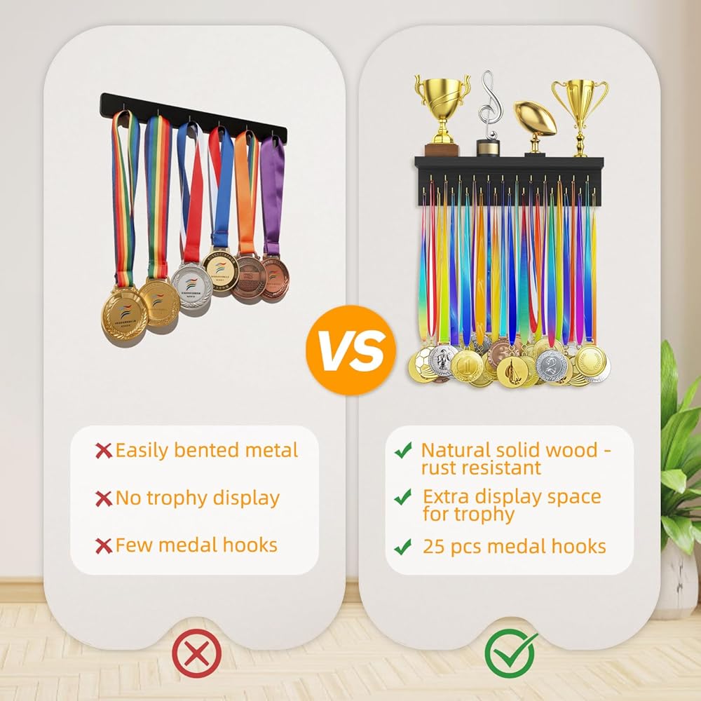 Premium Craftsmanship: The medal holder is made of natural solid wood with stainless steel hooks, which are waterproof and long-lasting; the medal display is strong to hold at least 25 medals and won't bend or break over time