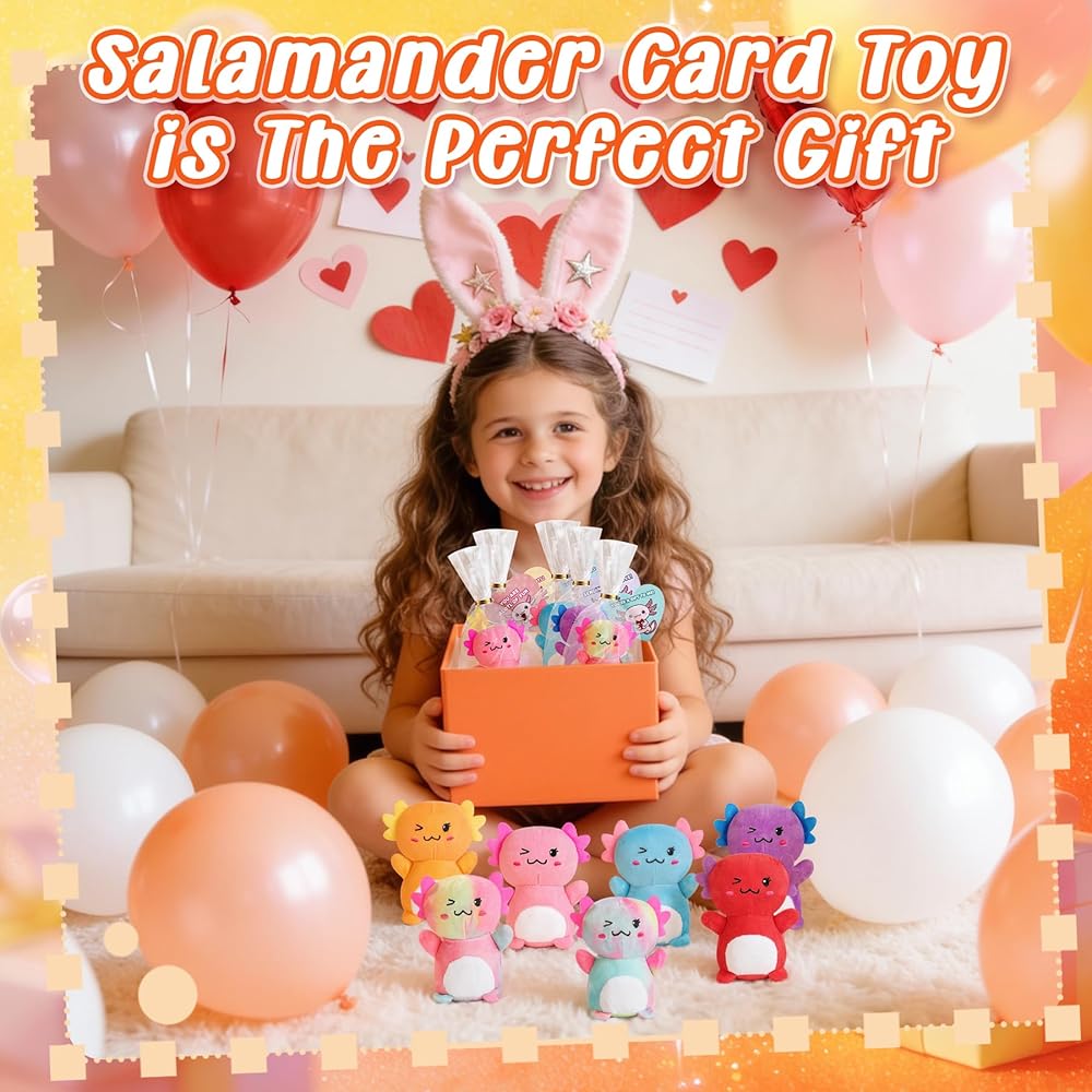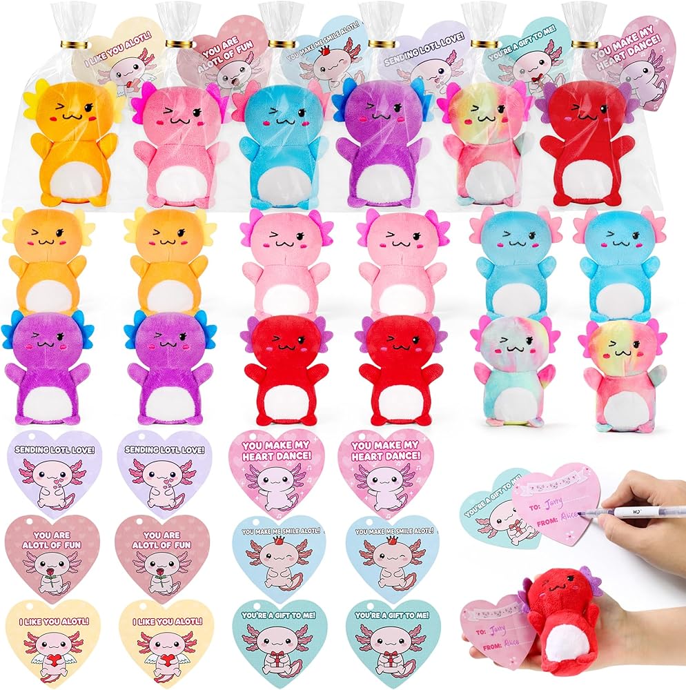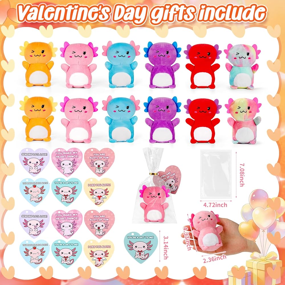12Pcs Valentines Day Gifts for Kids,Valentines Day Cards with Axolotol Stuffed Animal Gifts,4“ Axolotl Plush Toys,Mini Stuffed Animals Set for Boys Girls Classroom Exchange School Party Favors