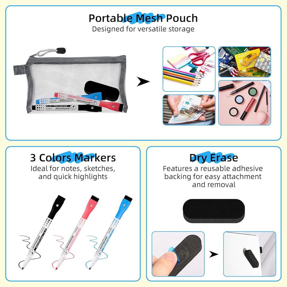 【Complete Accessories】The small whiteboard package comes with everything you need. There's a handy pen bag, three colored pens, and a large eraser. Each pen has an eraser at the end for quick fixes, and the board features a built-in pen holder, ensuring you're always ready to write notes