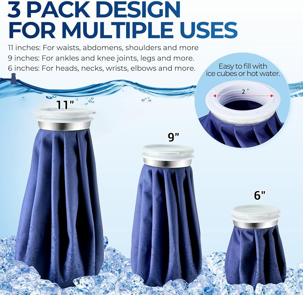 Ice Bags for Injuries Reusable: Ohuhu 3 Packs Ice Cold Packs with Wrap Ice Bag Hot Water Hot & Cold Therapy Pain Relief for Knee Leg Injury No-Leak Waterproof Ice Bags 3 Sizes 6"/9"/11", Blue