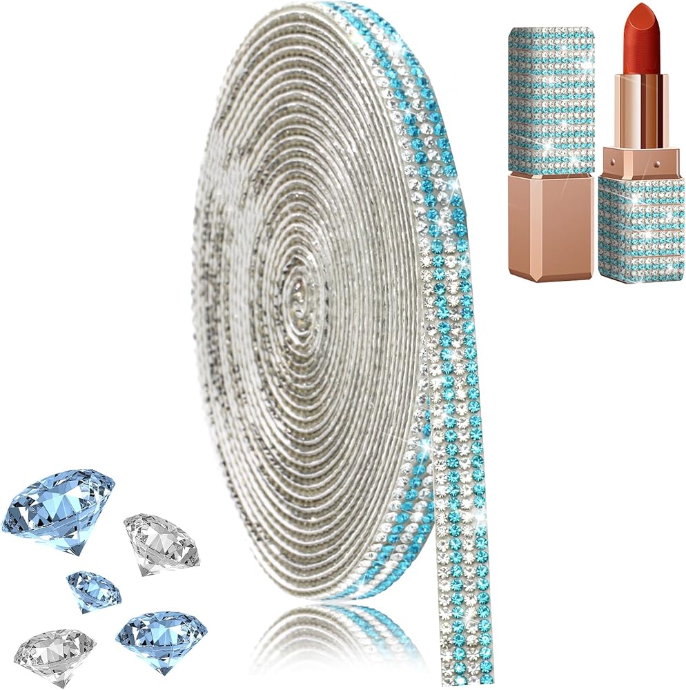 FULZTEY Shiny Rhinestone Ribbon Roll,4 Rows Diamond Ribbon with 2 mm Gem for DIY Craft,Lake Blue Rhinestone Tape Self Adhesive,Glitter 4 Yards Crystal Trim Sticker for Car Wedding Party Decoration