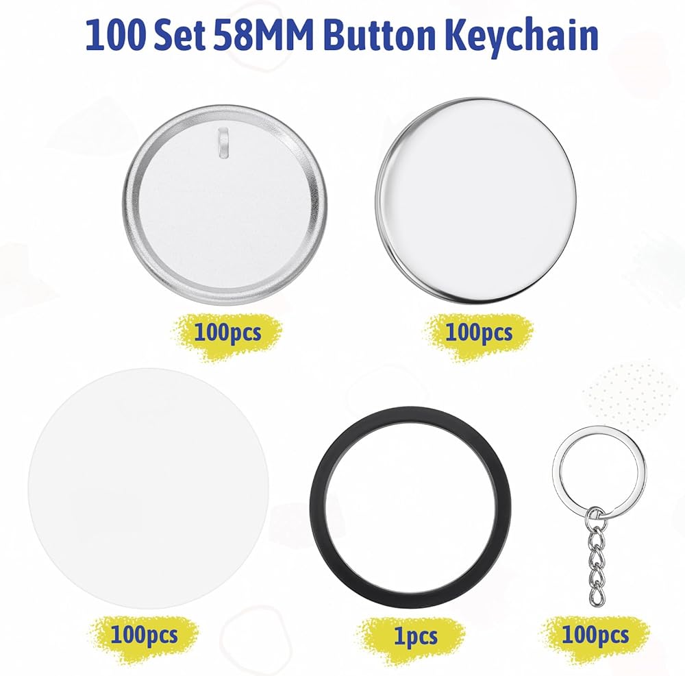 【Complete DIY Kit】The 100 Sets 58mm Button Maker Supplies include 100 metal shells, 100 transparent films, 100 back covers, 100 keychains, and 1 black ring. This comprehensive set allows you to create personalized badges or keychains for various occasions, such as school events, parties, or promotional activities. The high-quality iron alloy and PVC materials ensure durability and a professional finish.
