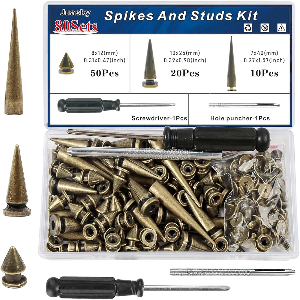 Spikes and Studs Kit:The bronze studs and spikes set includes 10 sets of 7x40mm,20sets of 10x25mm,50sets of 8x12mm spikes, 1 hole puncher, and 1 screwdriver.
