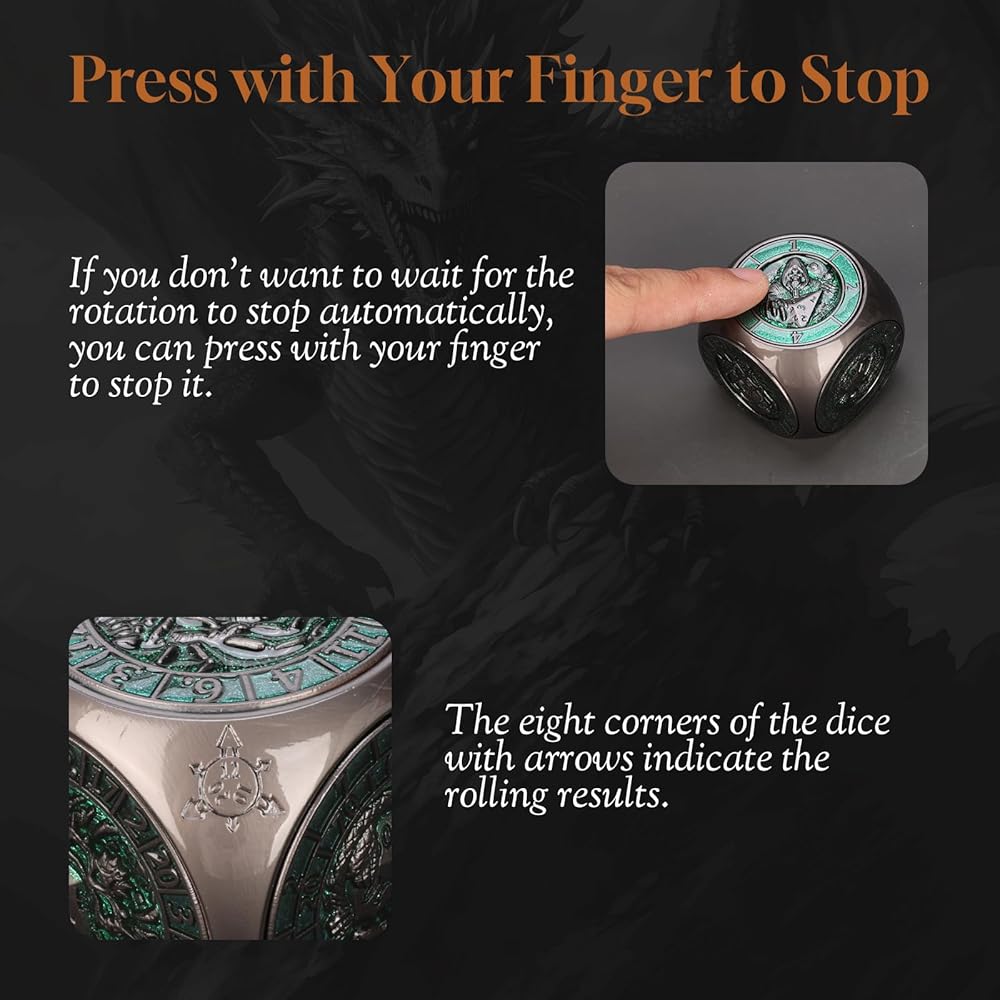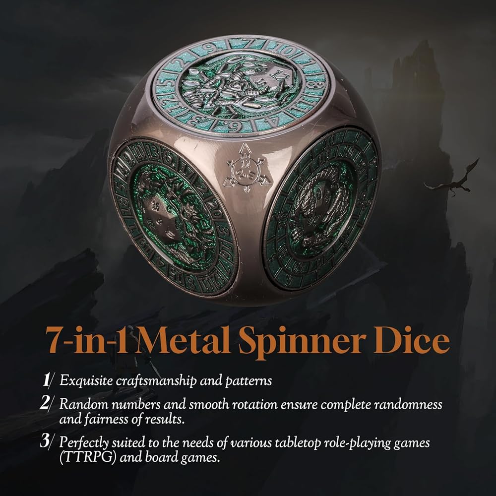 【Unique 7-in-1 Spinner Metal Dice】— This rotating dice includes D4, D6, D8, D10, D12, and D20, (D100 and D10 on the same face). It features a high-quality built-in rotator, ensuring random distribution of numbers for fair and unpredictable results. The triangular indicator arrows on the eight corners of the cube dice correspond to the rotating results. Ideal for various tabletop role-playing games.