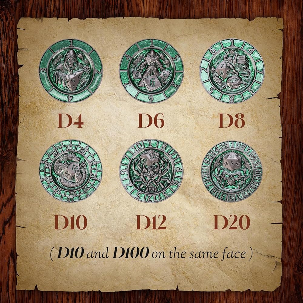 DND Spinner Dice, 2025 Unique Metal 7 in 1 D&D Cube Fidget Dice with 3D Relief for Dungeons and Dragon, Fantasy Role Playing Game Tabletop RPG Accessories Gift for DM & Player (Black-Green)