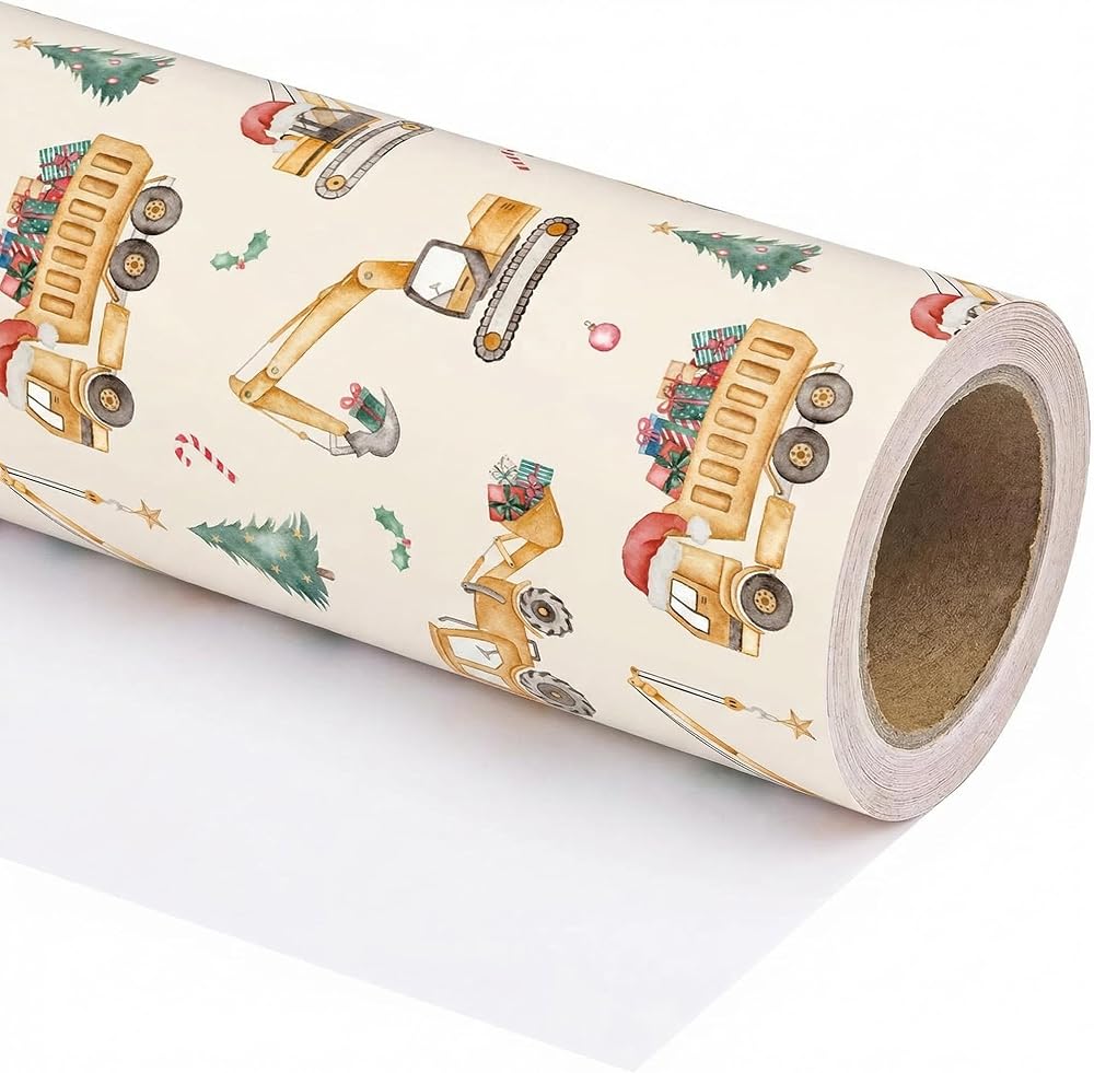 Unique & Playful Christmas Designs: Our Xmas wrapping paper features a construction-themed print with dump trucks, cranes, and excavators, all decked out in Santa hats, transporting colorful Christmas gifts and decorating Christmas trees