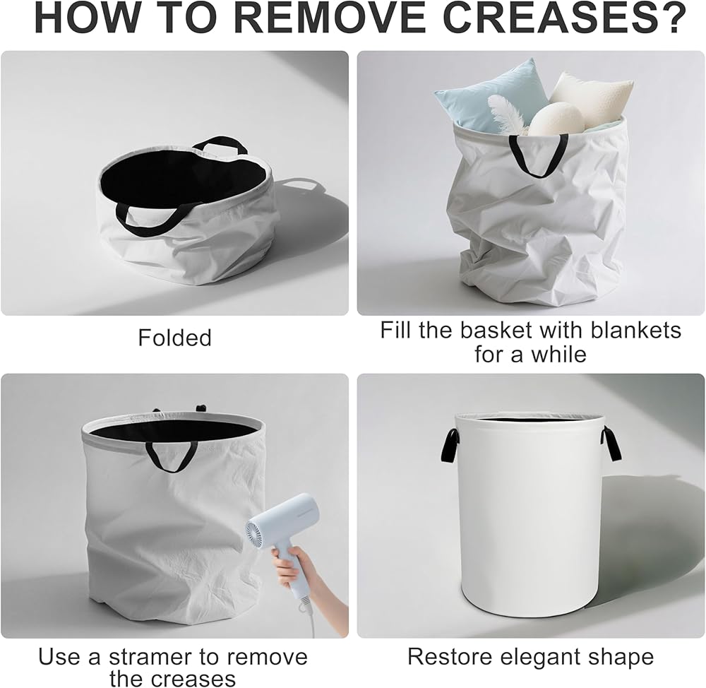 NOTE:The laundry basket is packed with compressed packaging, which may cause wrinkling during long-distance transportation. Don't worry! You can fill it with clothes or blankets,other items,and it will recover after a period of time. You can also smooth it with a steam iron and hair dryer.