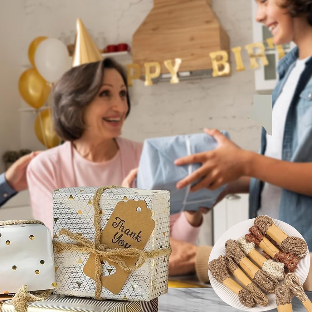 [Perfect for Present]: Suitable for gift packaging, birthday parties, wedding decorations and other occasions, adding a sense of sophistication to gift boxes, bouquets, invitations, etc. Use craft burlap ribbons to decorate dining tables, chair backs or Christmas trees to make the festive atmosphere more intense