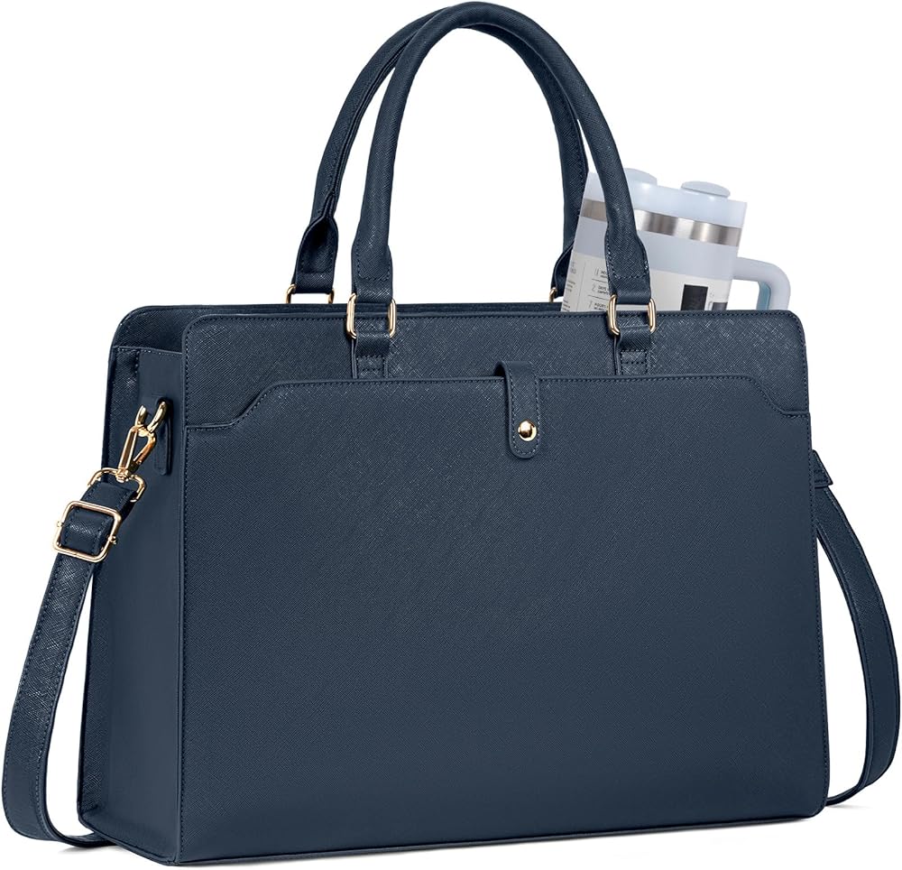【LARGE CAPACITY & MULTI-POCKET DESIGN】This leather womens laptop bag features a spacious main compartment with a padded laptop sleeve (15.4" × 7.9") that securely fits and protects your MacBook or other 15.6-inch laptops. Includes 2 side slip pockets, 2 pen holders, 2 small accessory pockets, and 2 interior zipper pockets to keep your essentials organized. Dedicated side pockets and slots provide convenient storage for an umbrella, water bottle, pens, and other office supplies