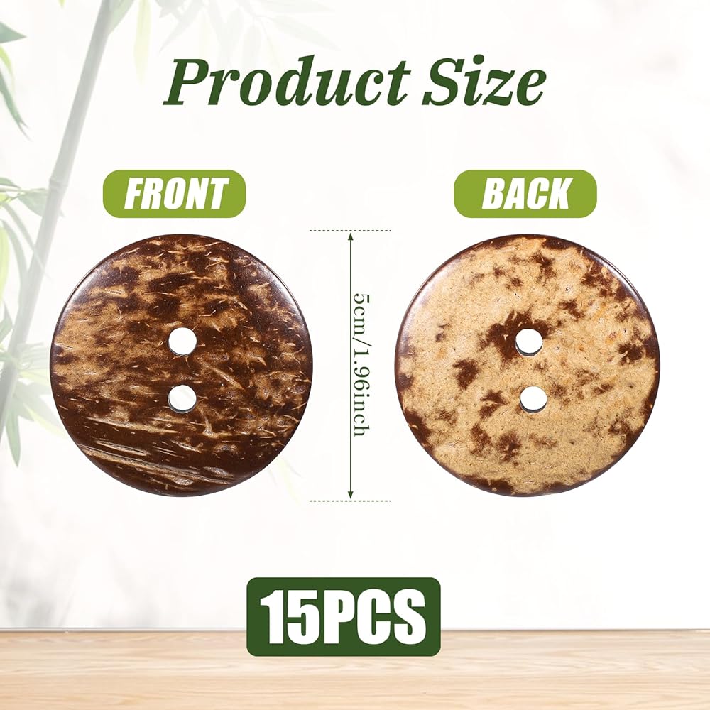 Generous Bulk Pack: 15-piece value pack of large 50 mm shell buttons. Each oversized 2-inch natural coconut shell button features twin holes for simple sewing. Perfect bulk buttons starter set for big projects.