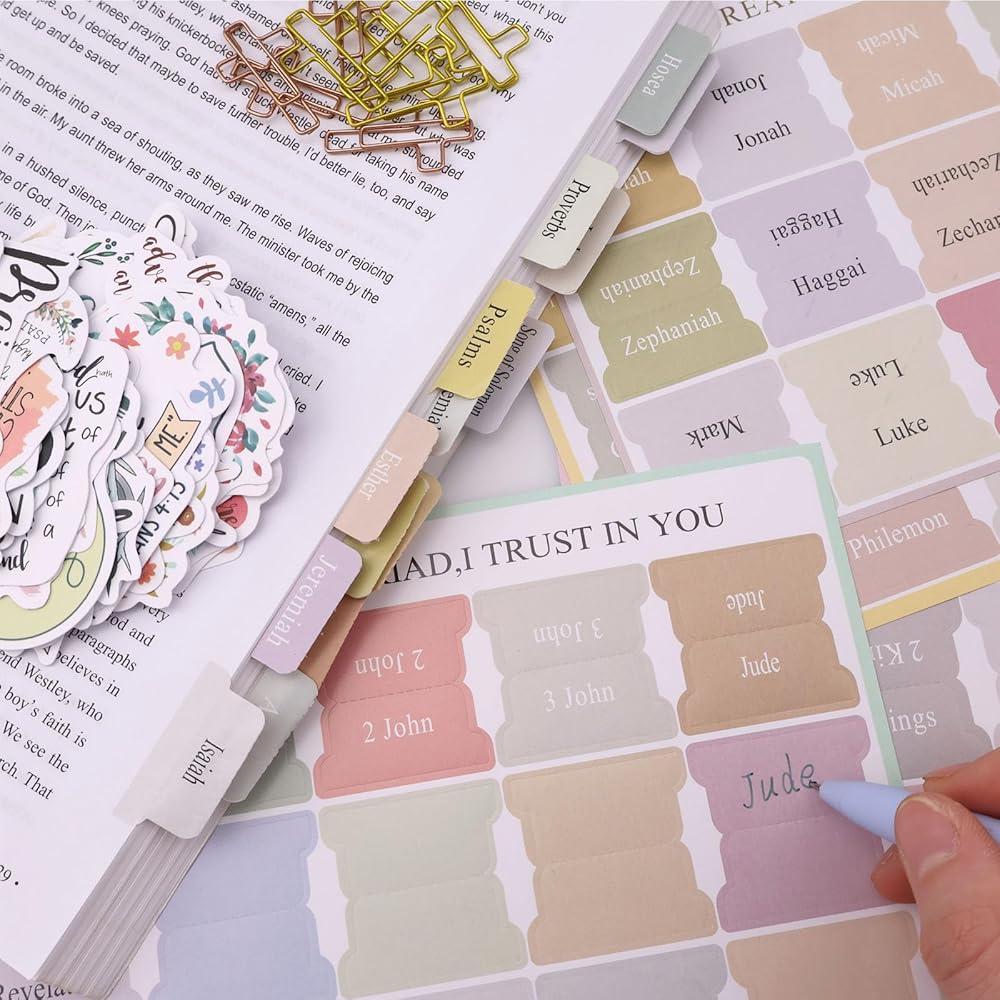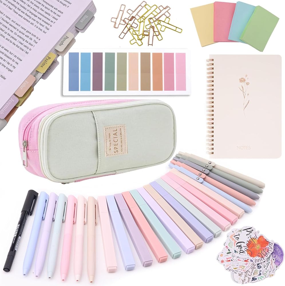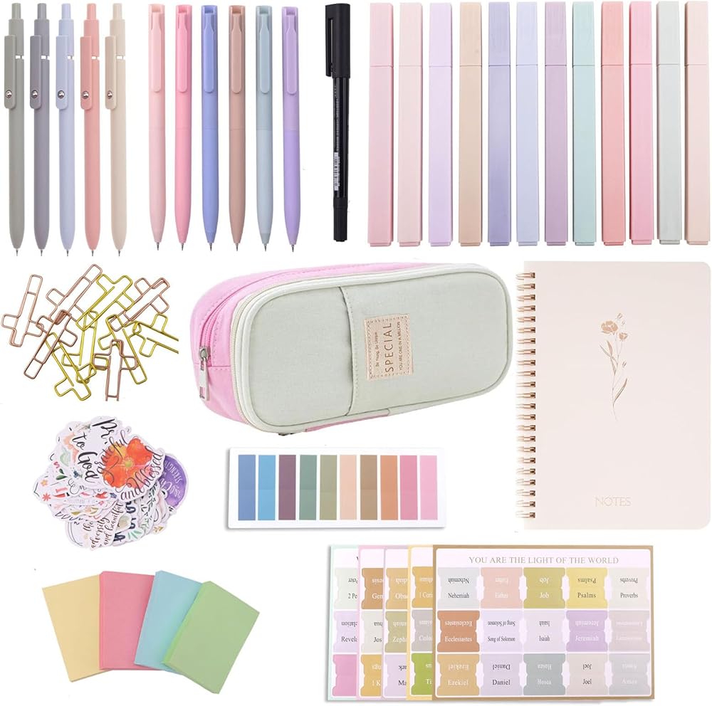 [ULTIMATE BIBLE STUDY KIT SUPPLIES]: 66 Bible tabs + 9 blank tabs, 12 Bible highlighters (no bleed!), 5 Bible pens + 6 multi-color pens, 4-color sticky notes, premium pen case, aesthetic spiral Bible notebook, scripture stickers & more. Perfect bible study for women