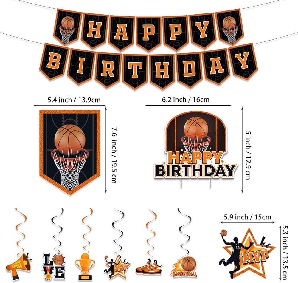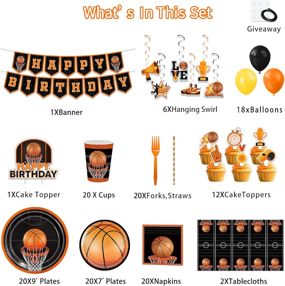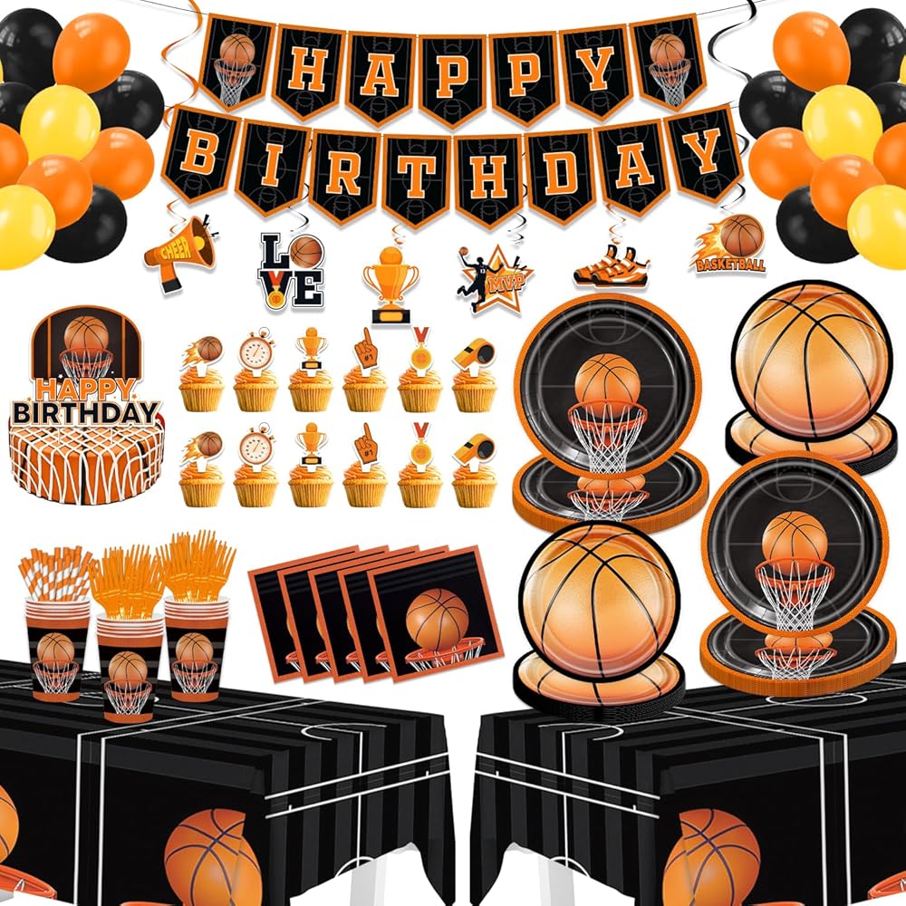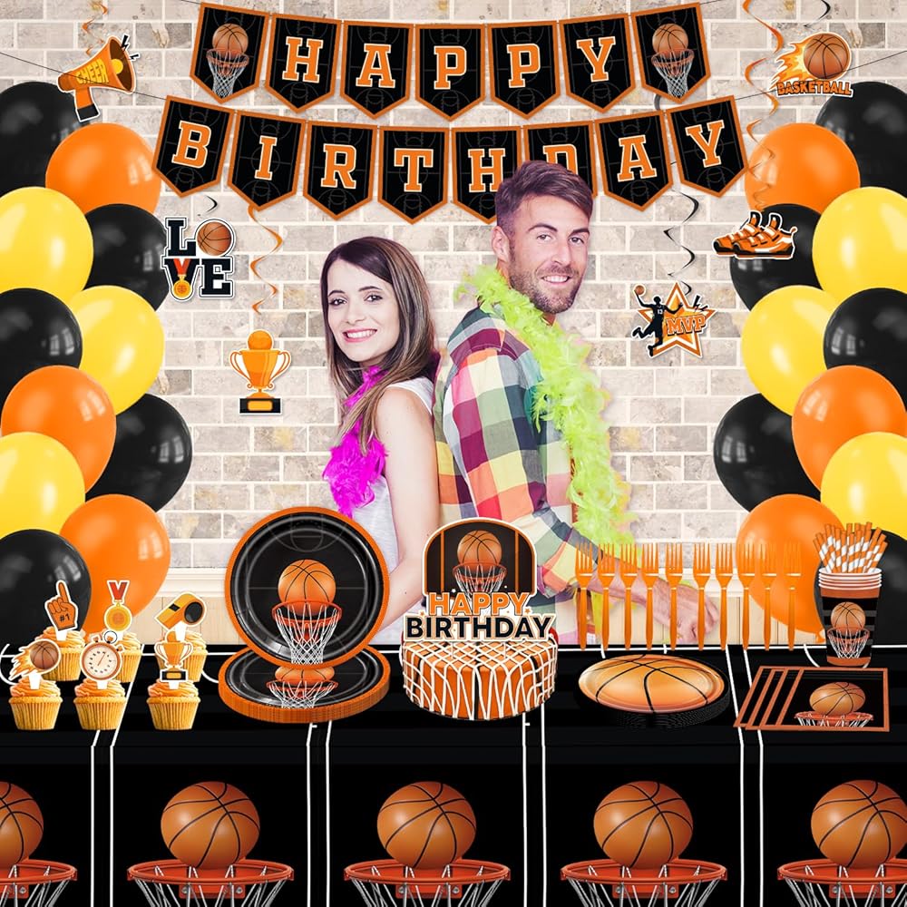 Basketball Birthday Party Decorations - 160PCS Basketball Party Supplies with Banner, Balloons, Hanging Swirls, Plates, Napkins, Cups, Forks, Straws, Tablecloths, Cake Topper, Cupcake Toppers