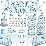 - Complete Party Set: Includes 1 banner, 6 hanging swirls, 20 plates 9", 20 plates 7", 20 napkins, 20 cups, 20 forks, 20 straws, 2 tablecloths, 1 cake topper, 12 cupcake toppers